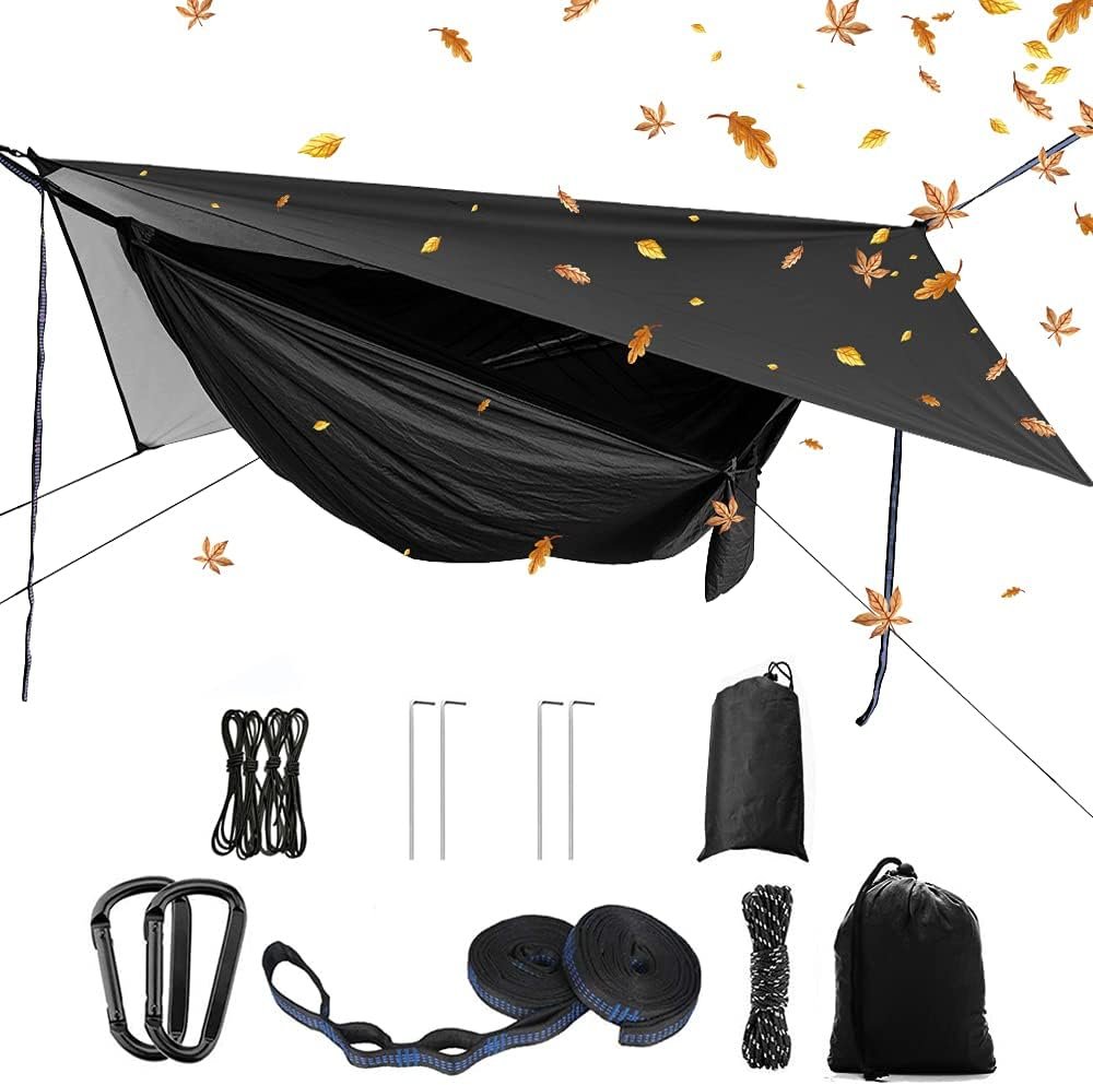 Portable camping hammock set. Including hammocks, mosquito nets, waterproof rain flies, tree belts, steel carabiner, piles, tree belts. This hammock set is the best camping gear on the market today.