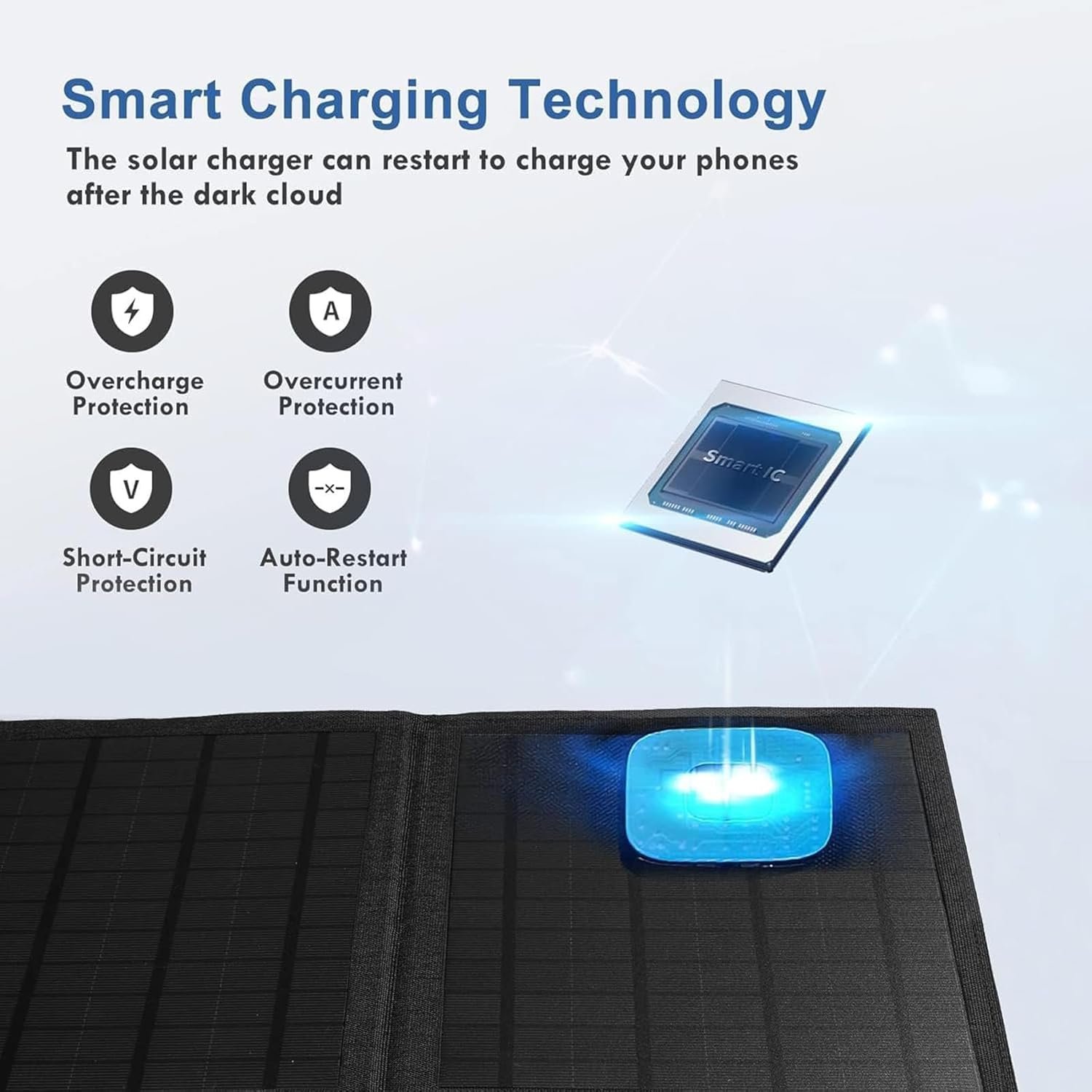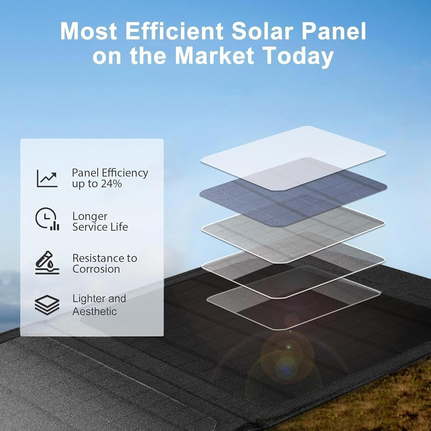 【High Conversion Efficiency】This solar panel pack has high solar conversion efficiency, almost twice that of most other foldable solar chargers on the market. Suitable for outdoor use, rooftops, RVs, camping, mountaineering, yachts, and other outdoor power sources.