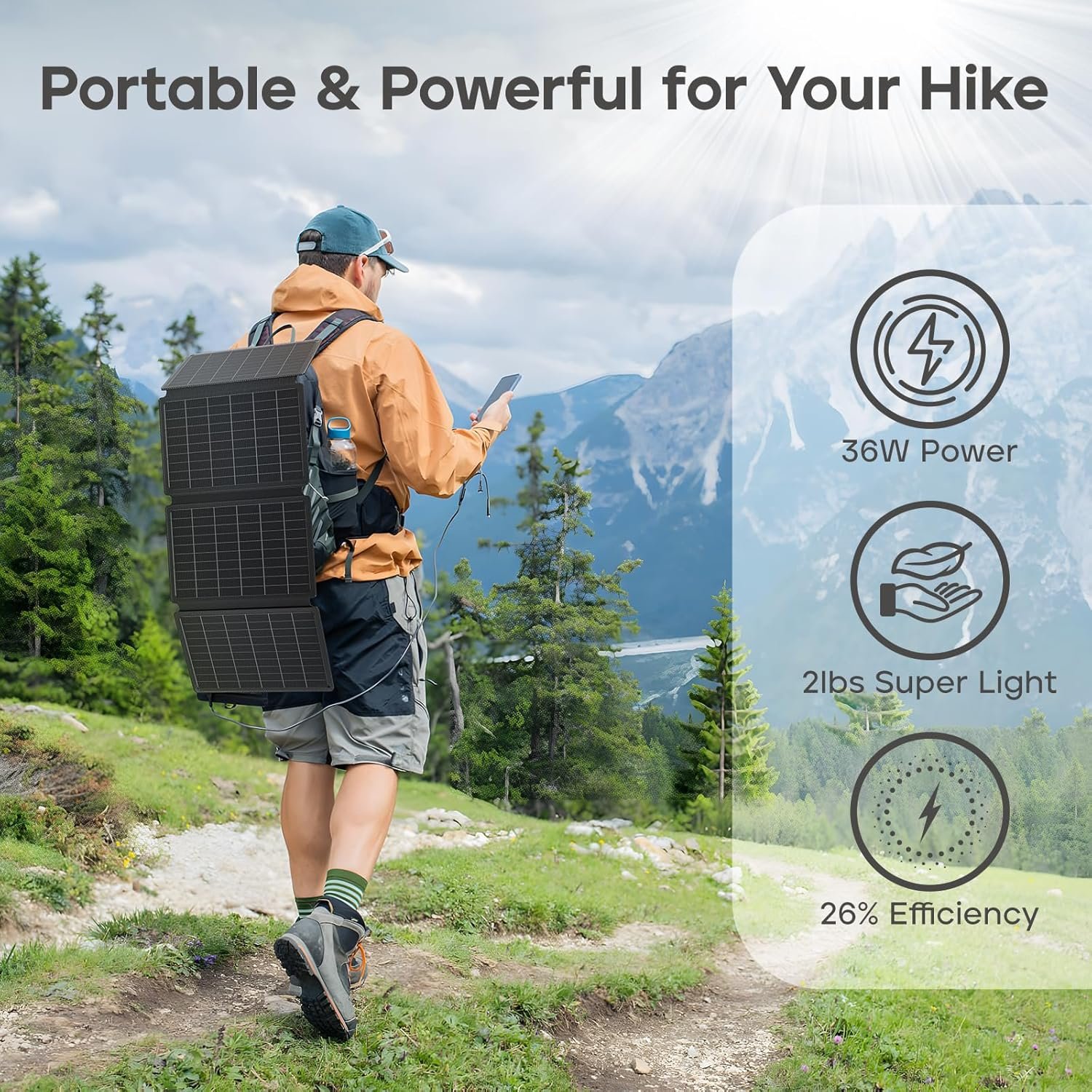 Portable Solar Panel 36W | 26% High-Efficiency Foldable Solar Panels with USB QC and PD Quick Charge for Camping, Hiking, Outdoor Trip, Compatible with Phones, Ipad & Tablets
