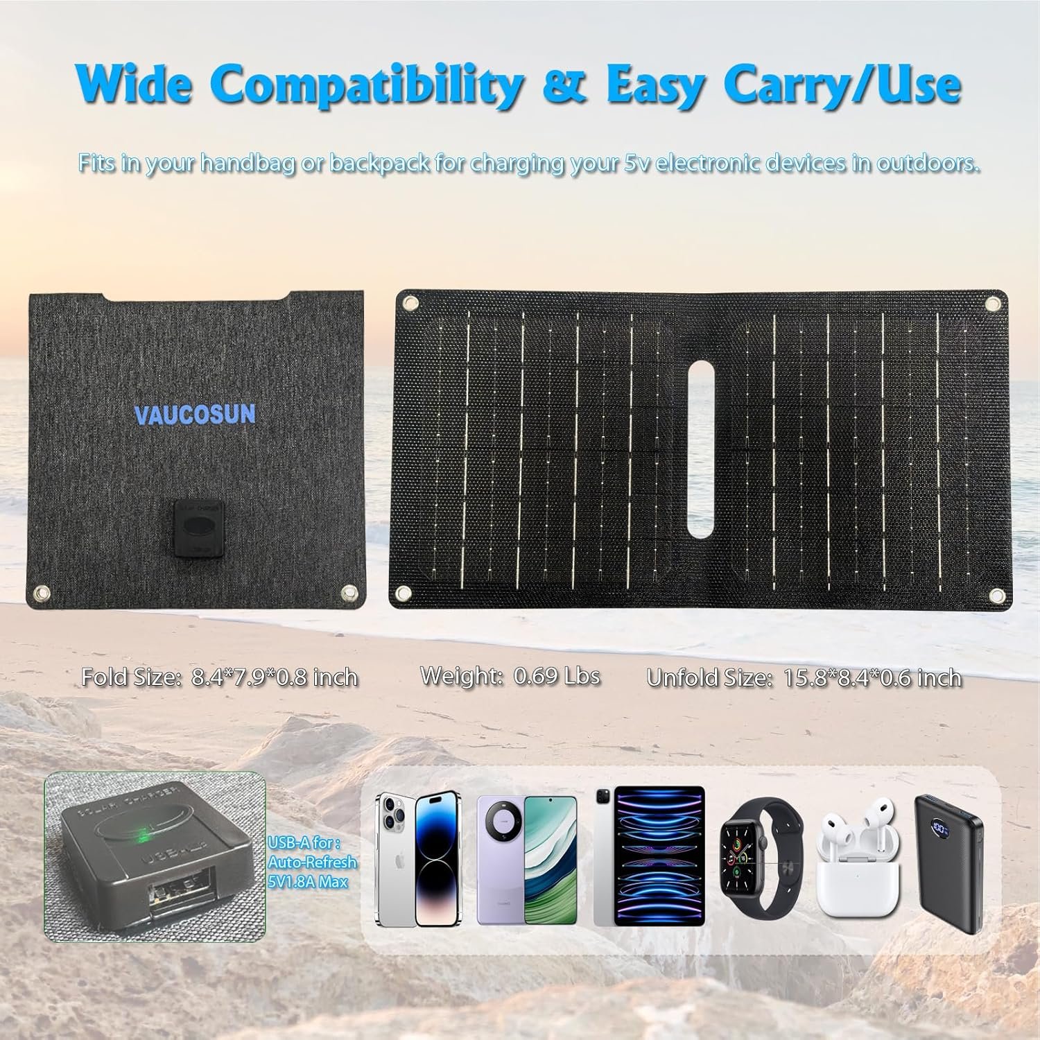 【Accessories and Support】You will get VAUCOSUN Mini Solar Panel Charger, 3.3ft USB-A to C Charge Cable, 2 hooks, User Manual and friendly Customer Service. 【Please Note】Any cloud or cover may influence the charging speed. Although our solar charger with automatic restart function, we still suggest you to reopen the solar panels and replug your device if the charging is too slow.