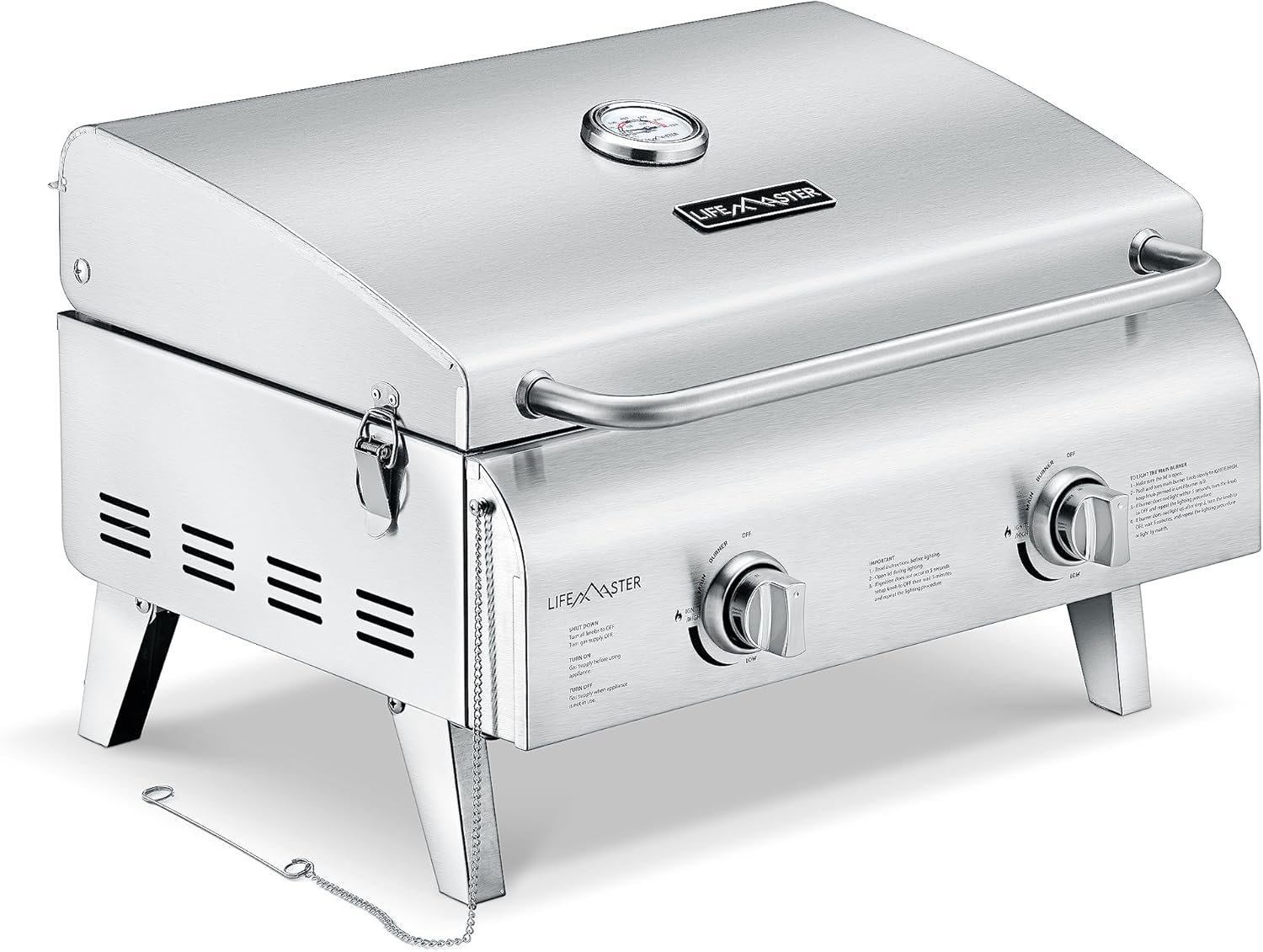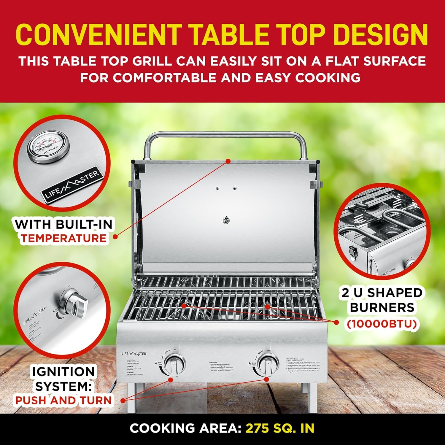 Full stainless steel structure Cooking area: 275 sq. in (514mm x 337mm) Main lid: SS430 stainless steel Firebox: SS430 stainless steel Lid handle: SUS430 stainless steel Cooking grid: SS430 stainless steel Ignition system: push and turn Main burners: 2x 10000BTU, U-shaped US regulator and hose included Easy to set up and use A compact and reliable solution for your next outdoors adventure. Whether you camp, travel around in your motorhome or RV or like to spend the day at the park or in the great outdoors with friends and family. You can now enjoy freshly prepared cooked food away from home without the expense of restaurants and cafes. Grill your favorites, try out new recipes and impress everyone with your outdoor cooking skills with minimal fuss. BUY NOW and use our space saving, portable outdoor BBQ grill on your next camping trip and enjoy the comforts of home cooked food wherever you travel