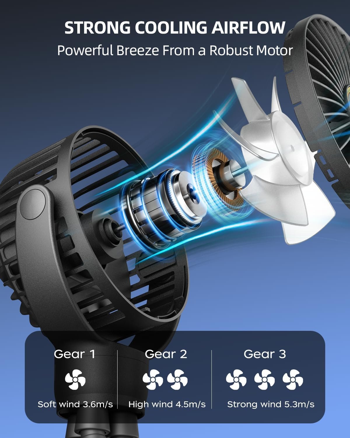 PORTABLE & EASY TO USE: The fan is battery-powered, so you can take it with you wherever you go. It is lightweight and compact, making it easy to carry and store. The built-in rechargeable battery provides long-lasting power and can be recharged via USB.
