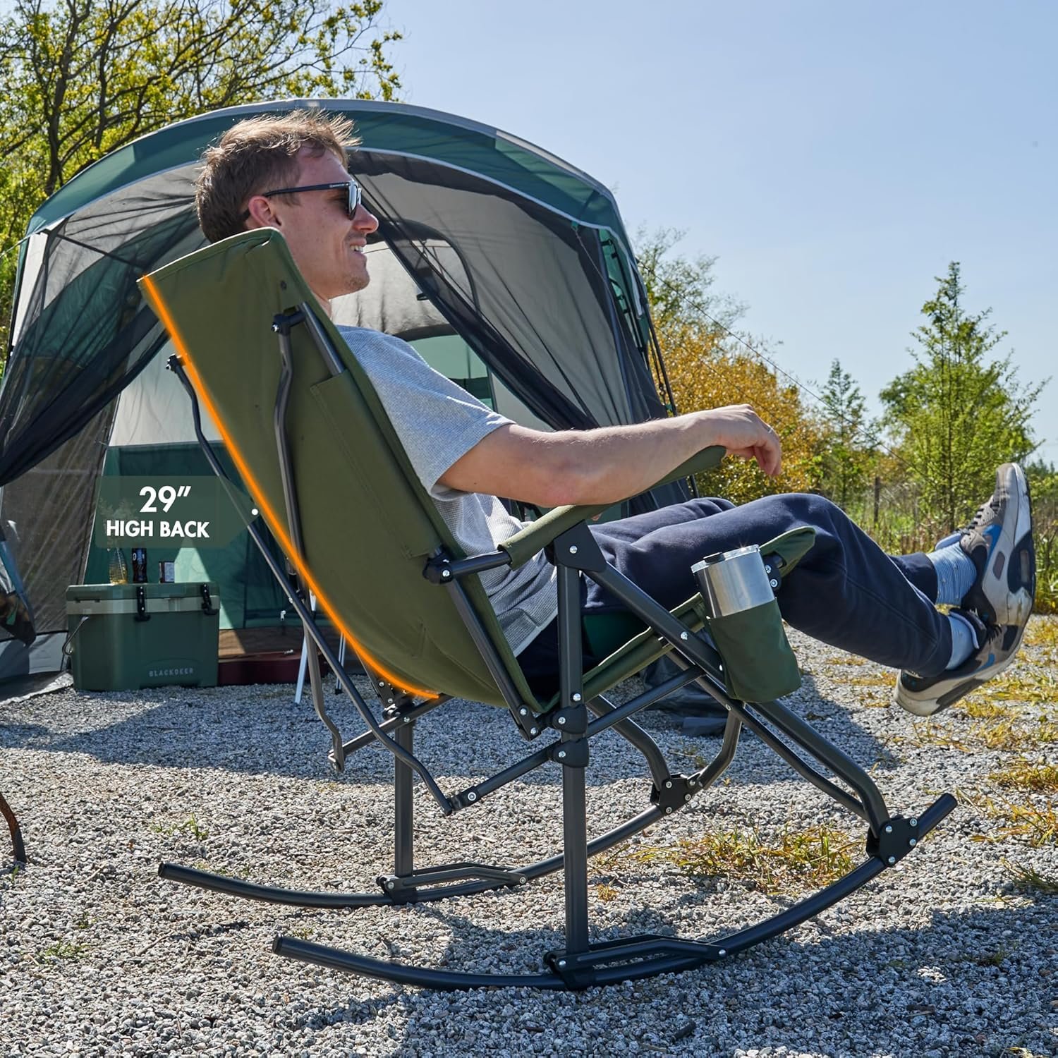 29″ High Padded Back: This camping rocking chair has a 29″ padded backrest which will provide full support to your shoulders and head. The padded back is specially designed to provide enough coziness for you to relax and chill. It also has pockets and a cup holder on the sides for your convenience.