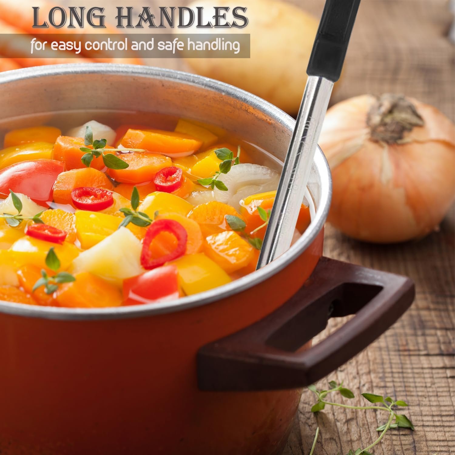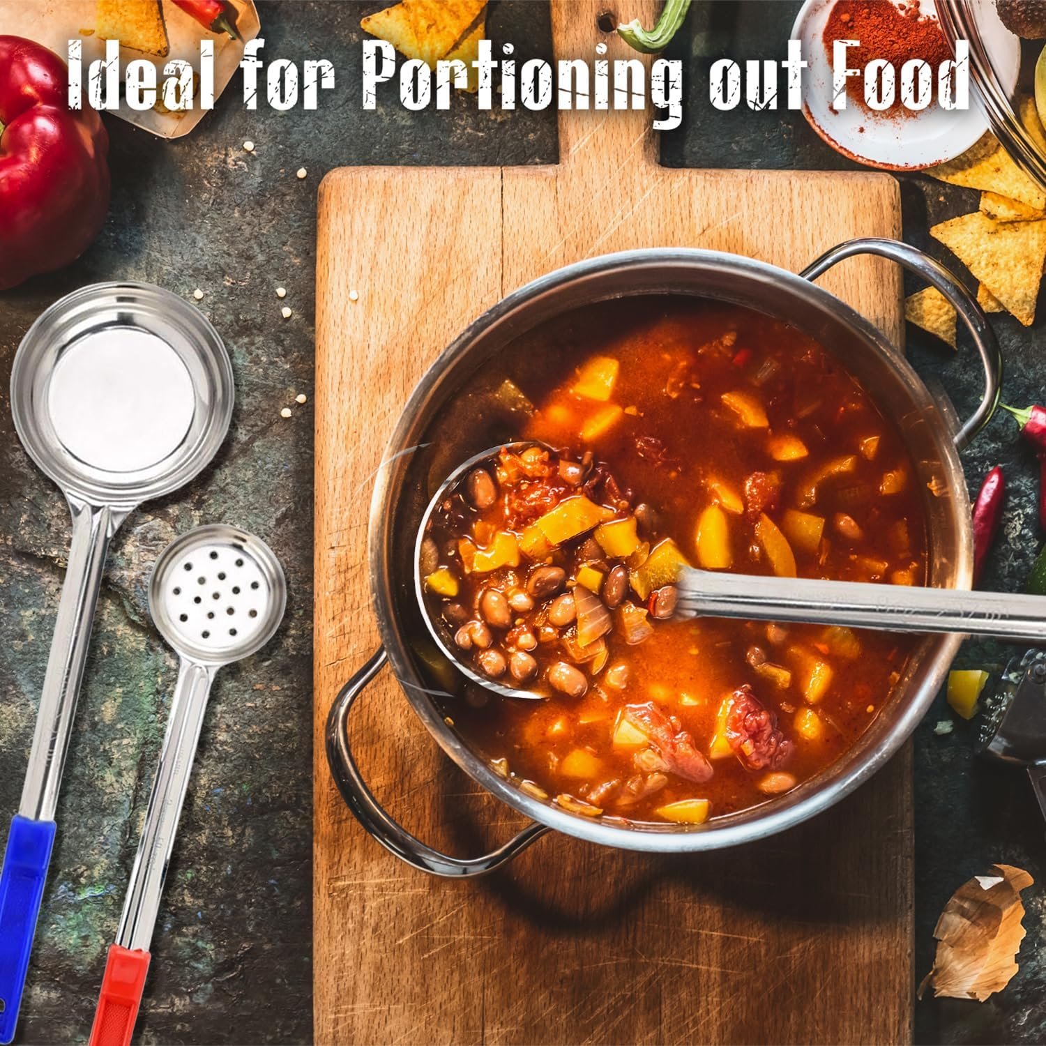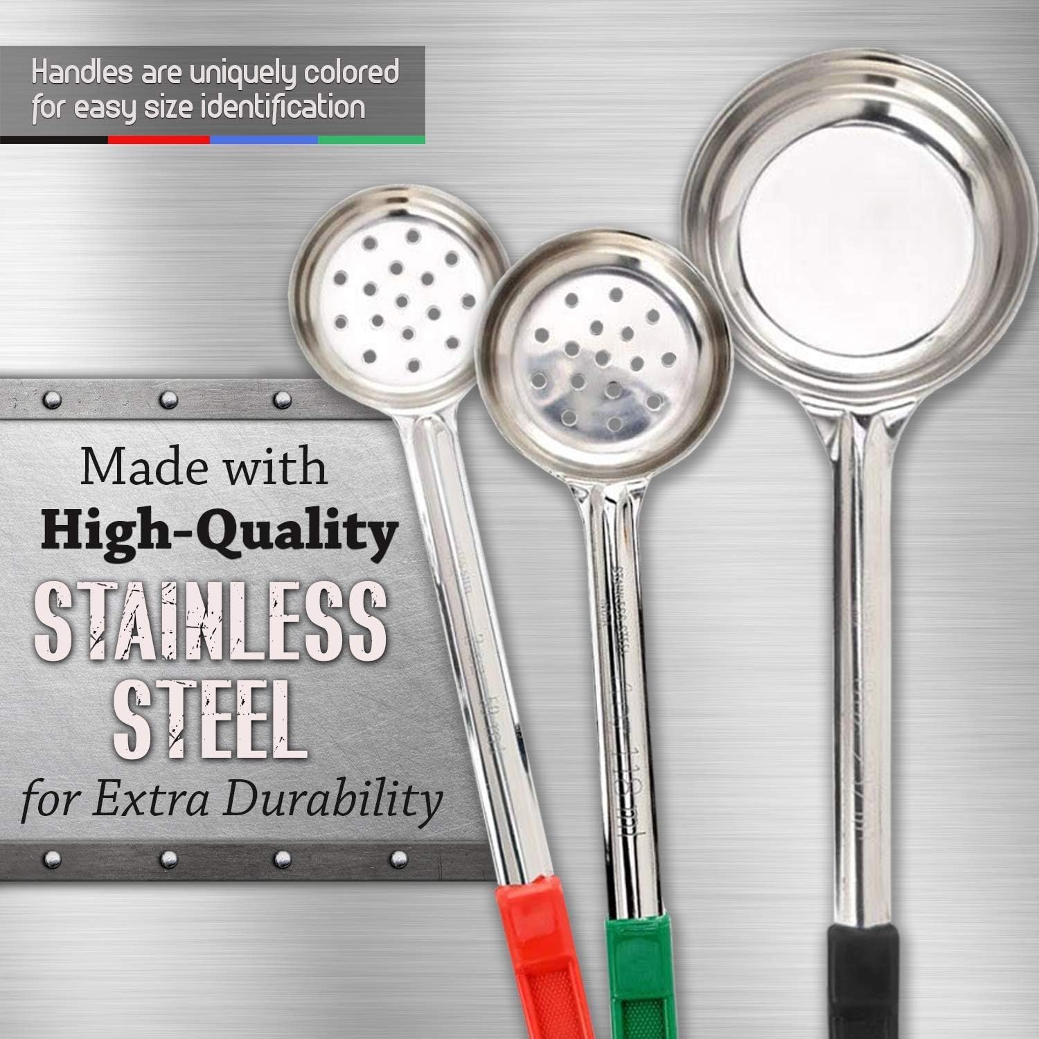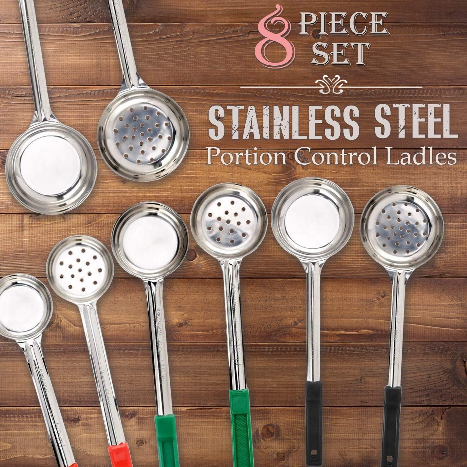 Portion Control: Our 8-piece cooking utensils set with a range of serving ladles (2oz, 4oz, 6oz, 8oz) in two styles, solid-bottom and slotted to easily drain liquids; for controlling food portions.