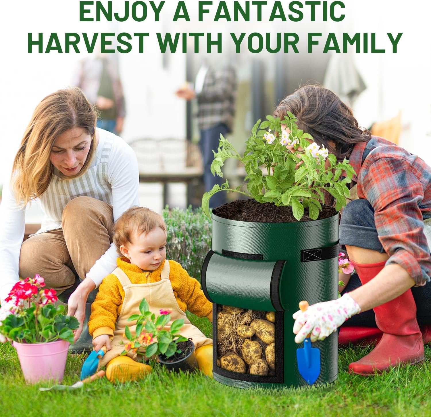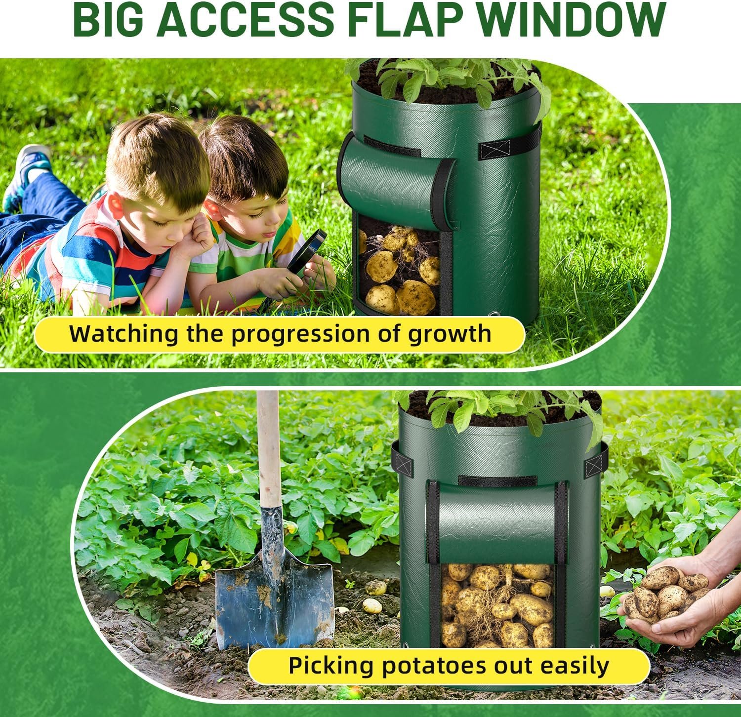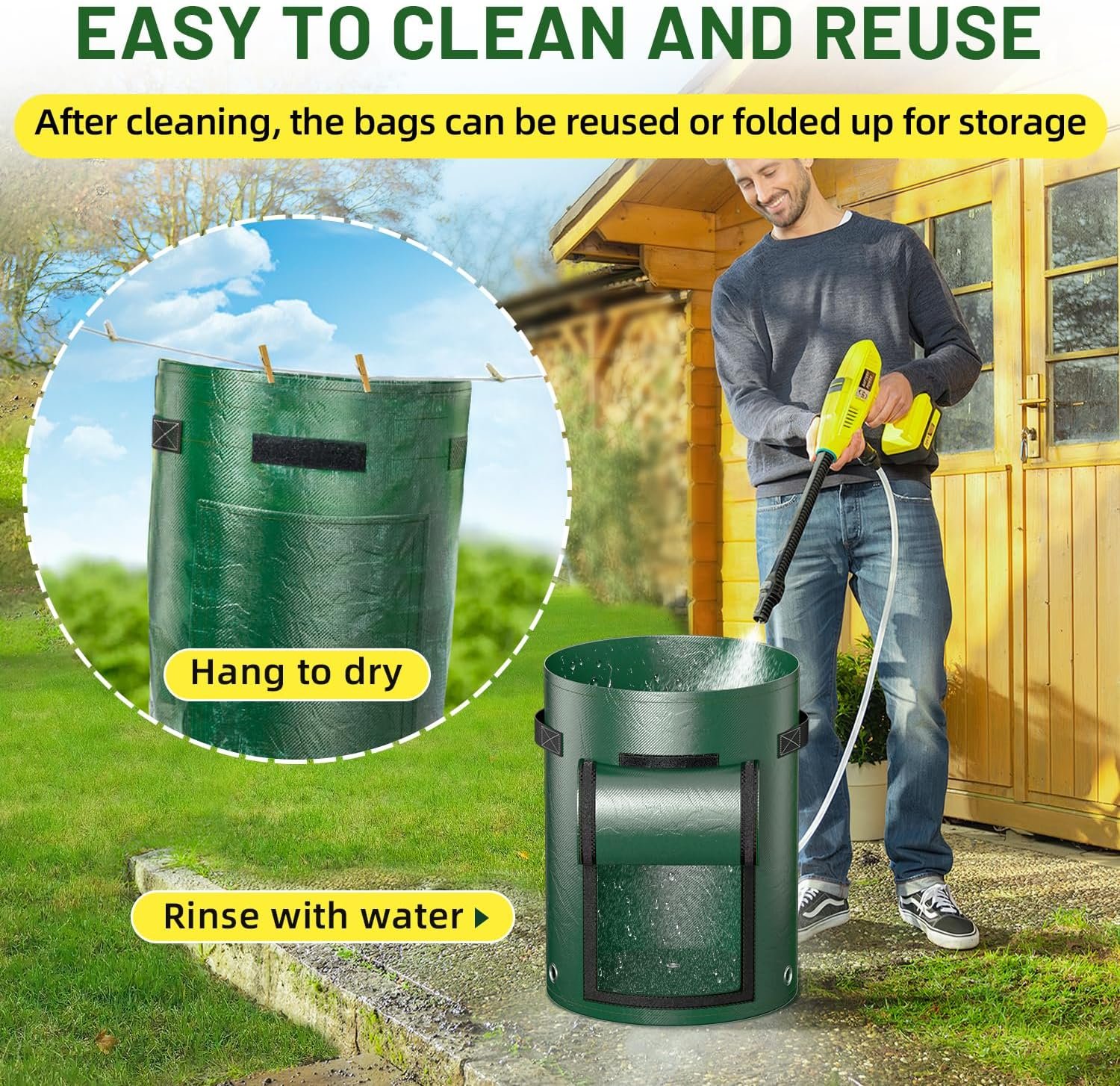 Durability and Resuable: The heavy duty potato growing bags are made of sturdy PE material, with well constructed and strong sewn seams. Easy to clean, The potato planter are washable, just rinse with water and let it dry, it can be used in the next year