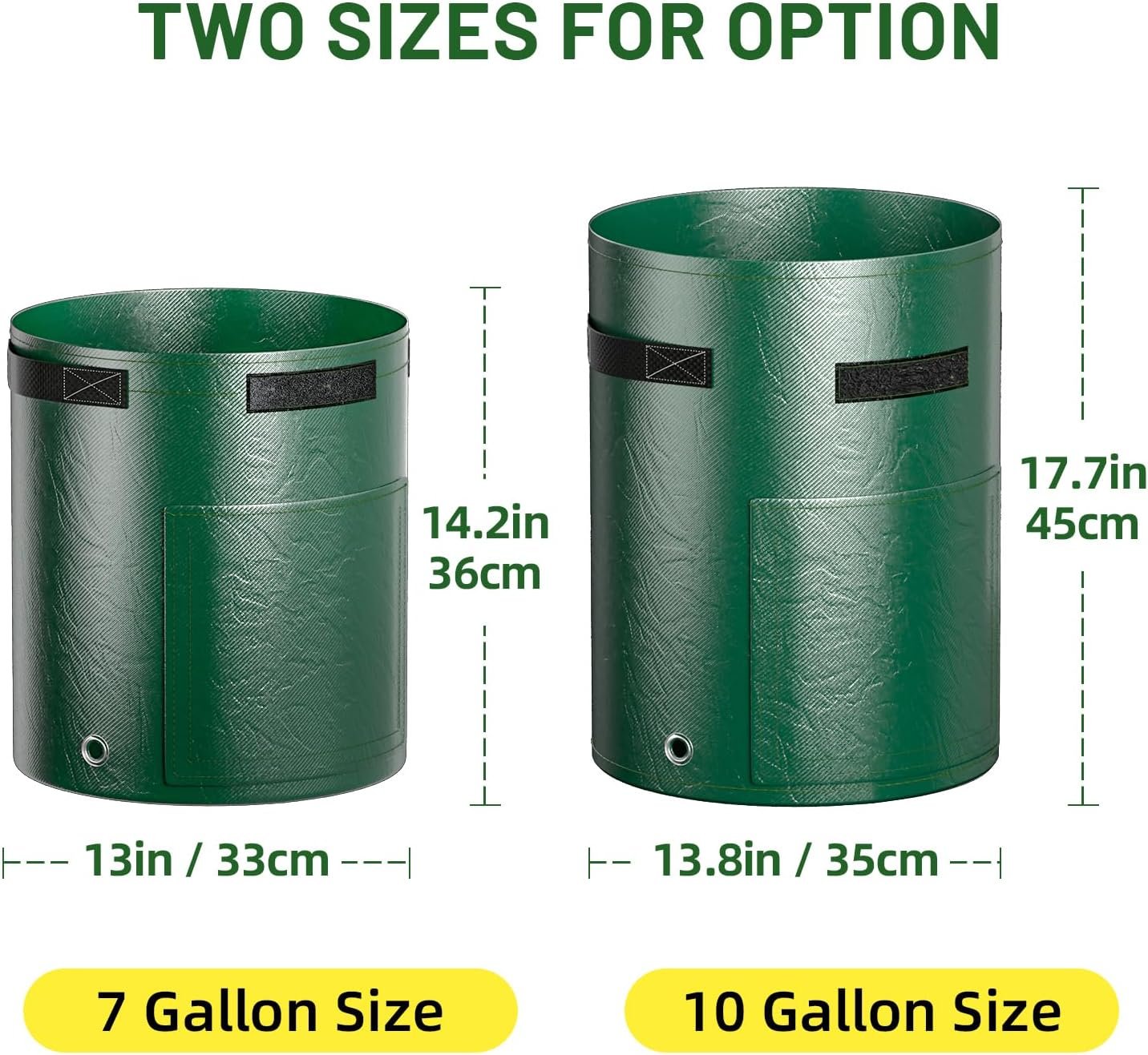 Large Bags Space and Correct Color: We have 7 gallon grow bags and 10 gallon grow bags, provide an enough growing space to grow a variety of vegetables. The potato grow bag is green, which is the suitable color to blend in with your garden set up