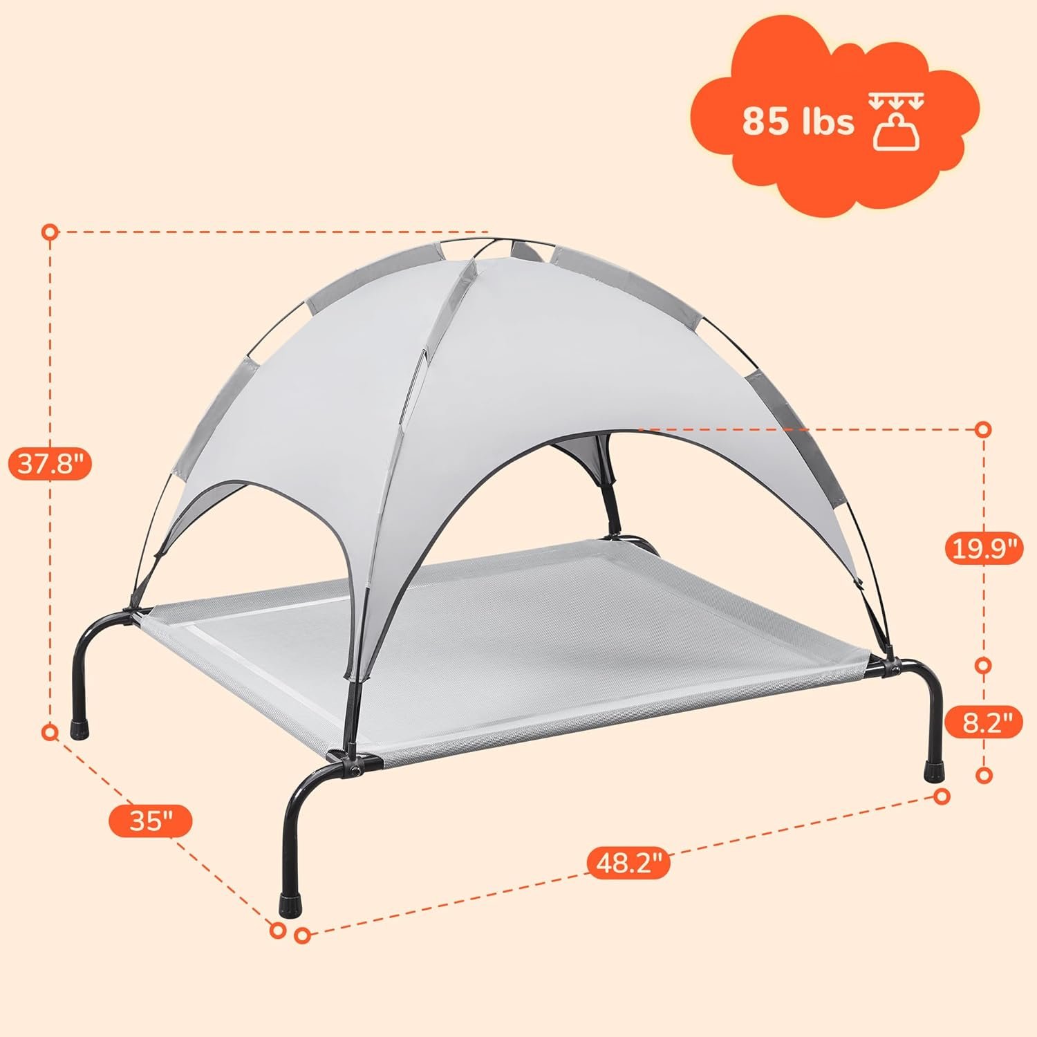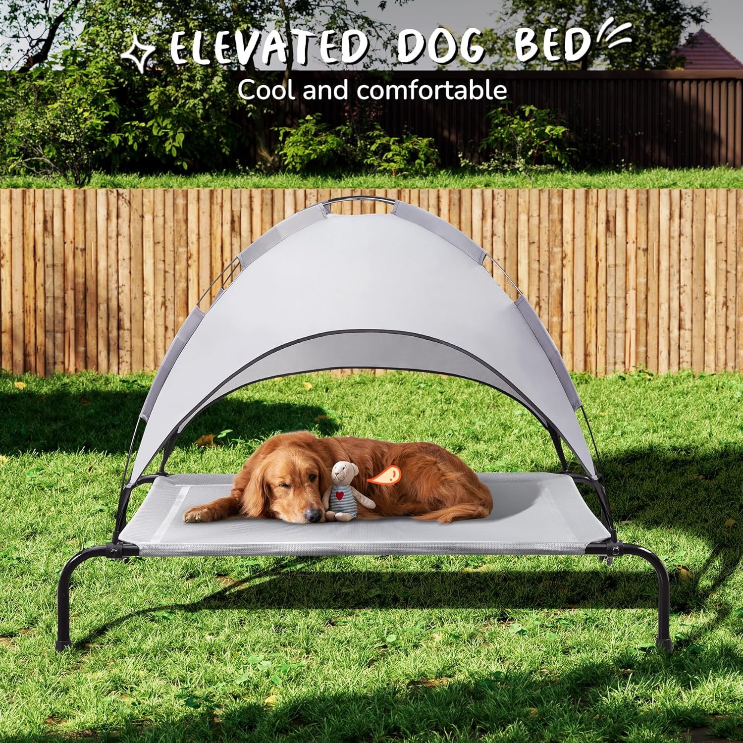 PRAISUN XL Outdoor Dog Bed with Canopy, Elevated Dog Bed, Textilene Mesh, Metal Frame for Indoors, Outdoors, Lawn, Sliver Grey