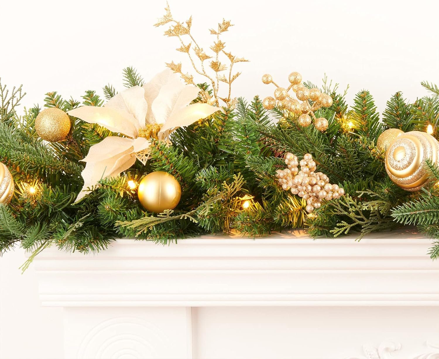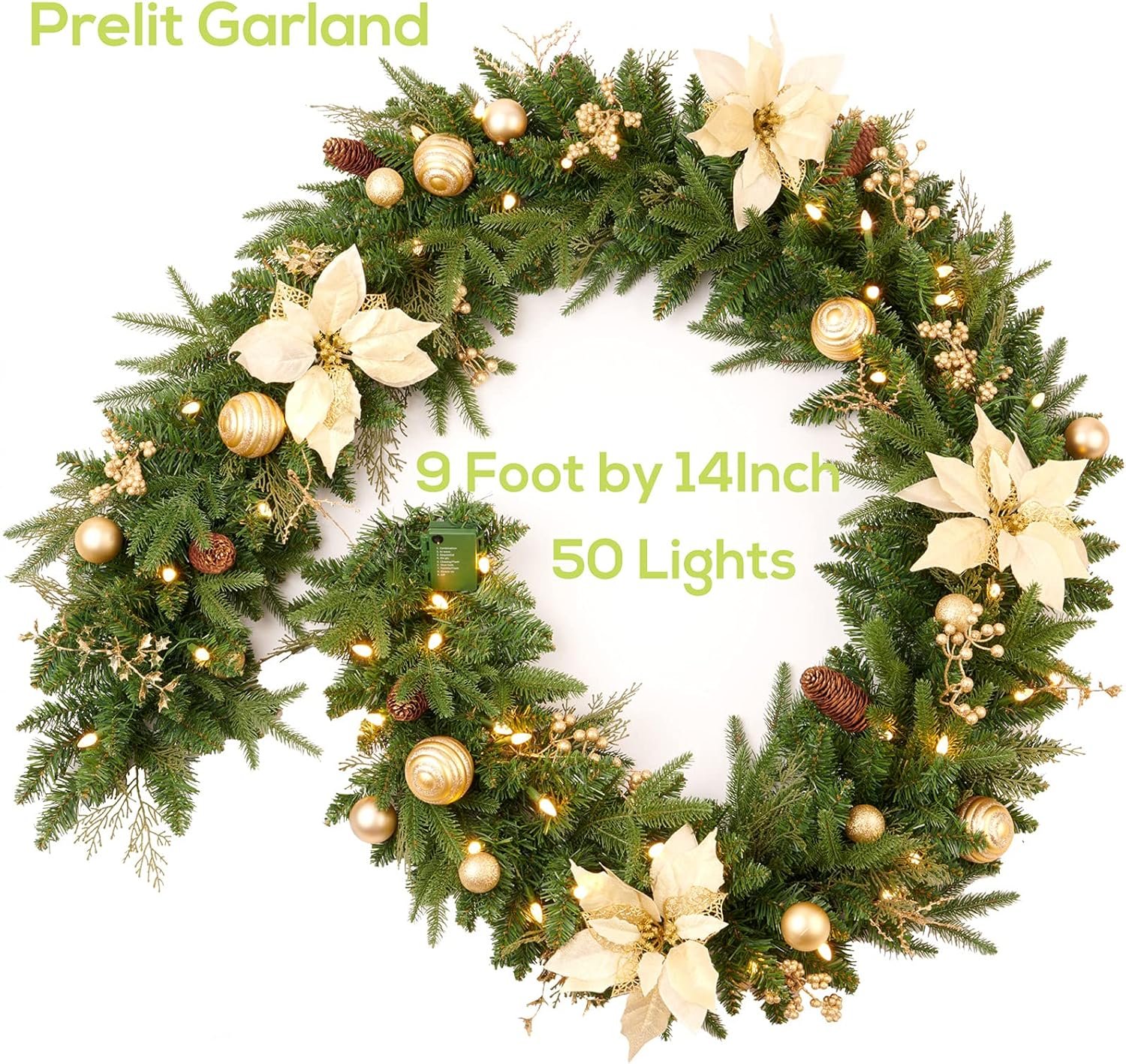 Pre-lit 9ft Christmas Garland with Gold Berries and Balls,Pine Cone,Golden Flower and 50 Battery Operated Soft White LED Lights with Timer,Artificial Holiday Decoration Door Outdoor