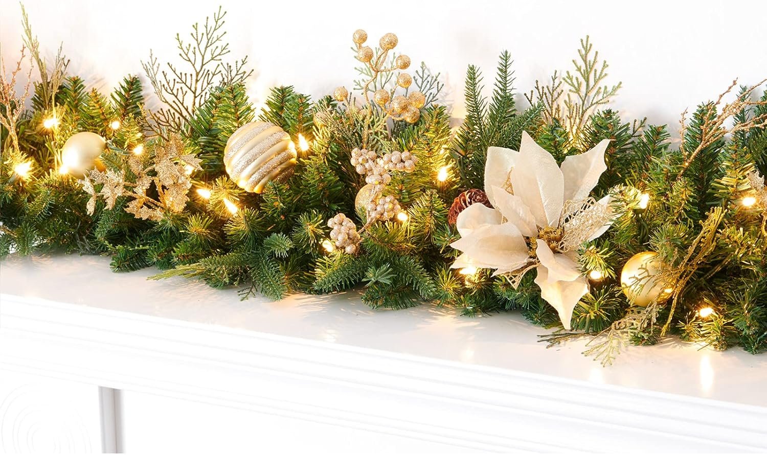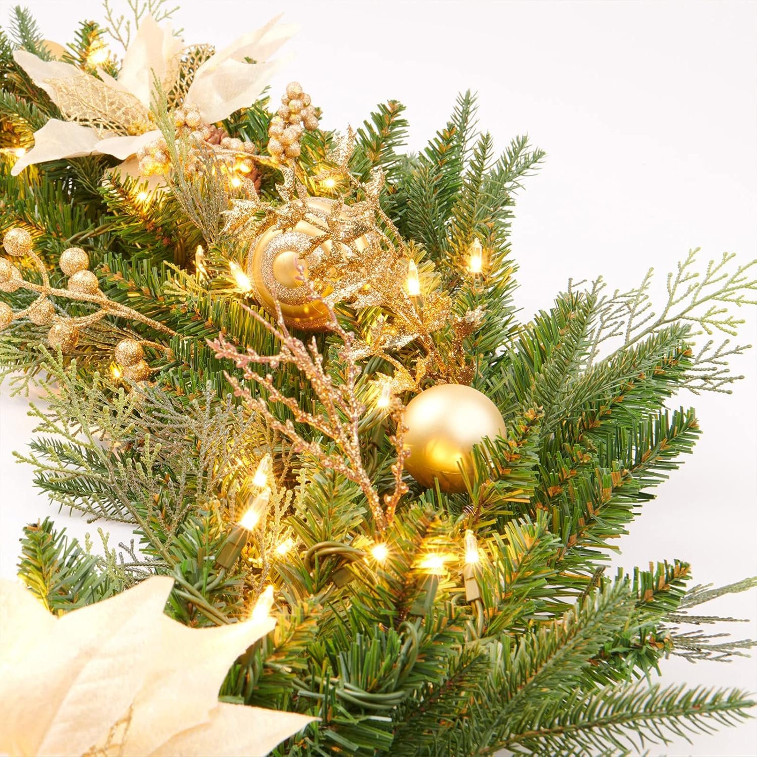 BEAUTIFUL DECOR:Trimmed with pine cones Gold balls,Gold berries and gold flowers,made of flame-retardant PVC and PE Fire resistant and non-allergenic