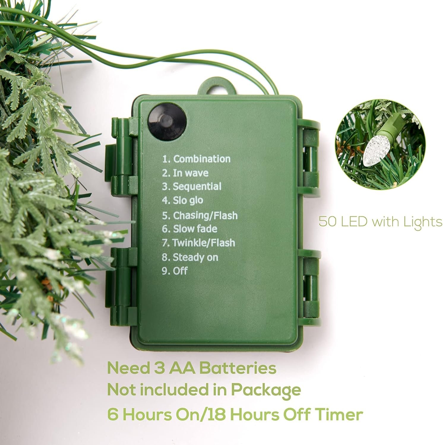 BUILT-IN LIGHTING:Pre-strung with 50 battery operated warm white LED lights with The light stay on even when a bulb goes out,integrated 6 hours On/18 hours Off timer (Need 3 AA batteries, not included)