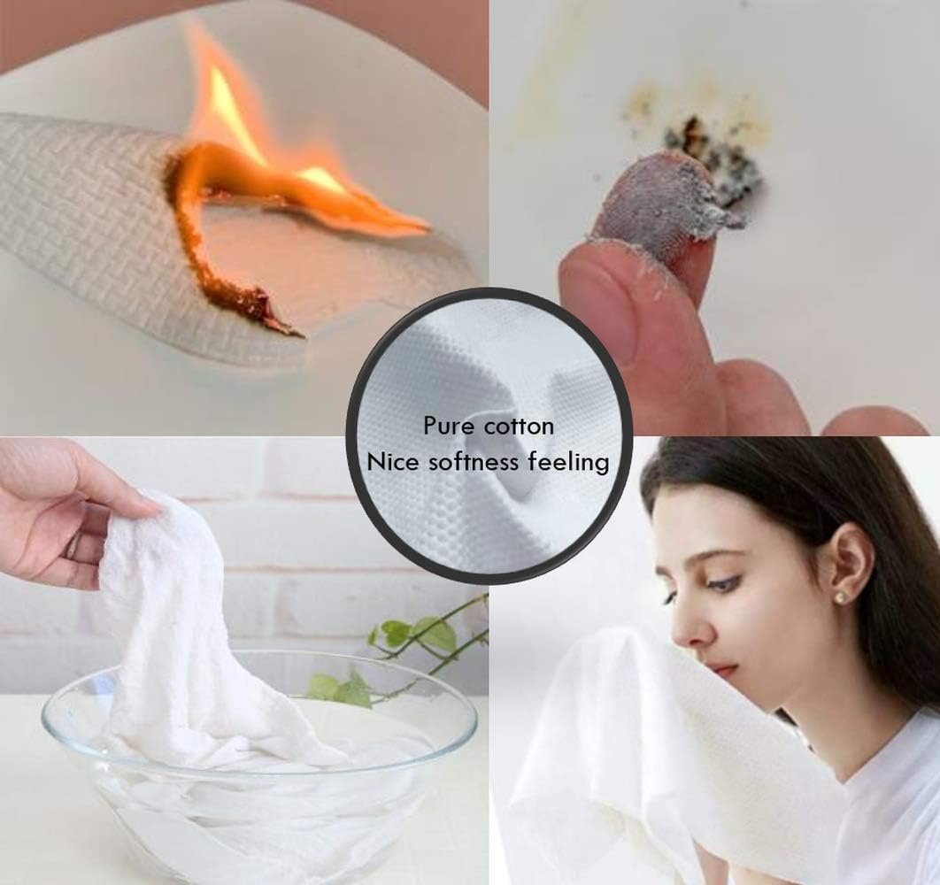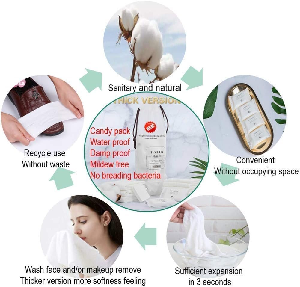 👍EASY TO USE cotton disposable towels: A tablespoon of water will turn the compressed towel into a durable and reusable towel in 3 seconds. So, the compressed towel is also called magic towel. After using the compressed towels several times for hands or face wiping, you could also reuse it as rag for general household cleaning (suitcase, shoes, desktop)