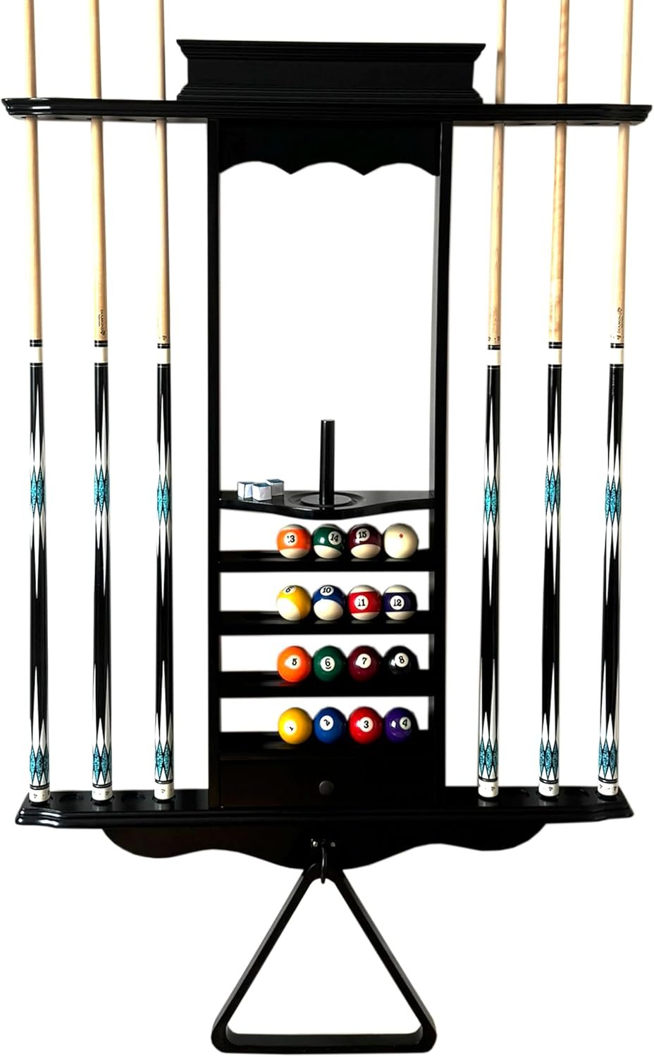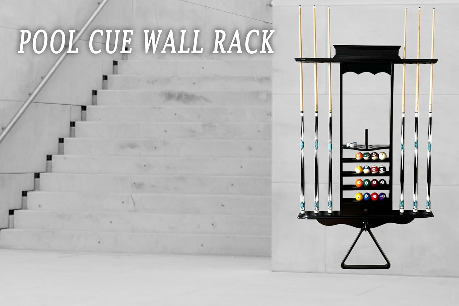 Ample Storage Capacity: This billiard wall rack designed to hold up to 10 cue sticks of any size, a full set of billiard balls, a triangle ball rack, and cone chalk, keeping your game room organized.