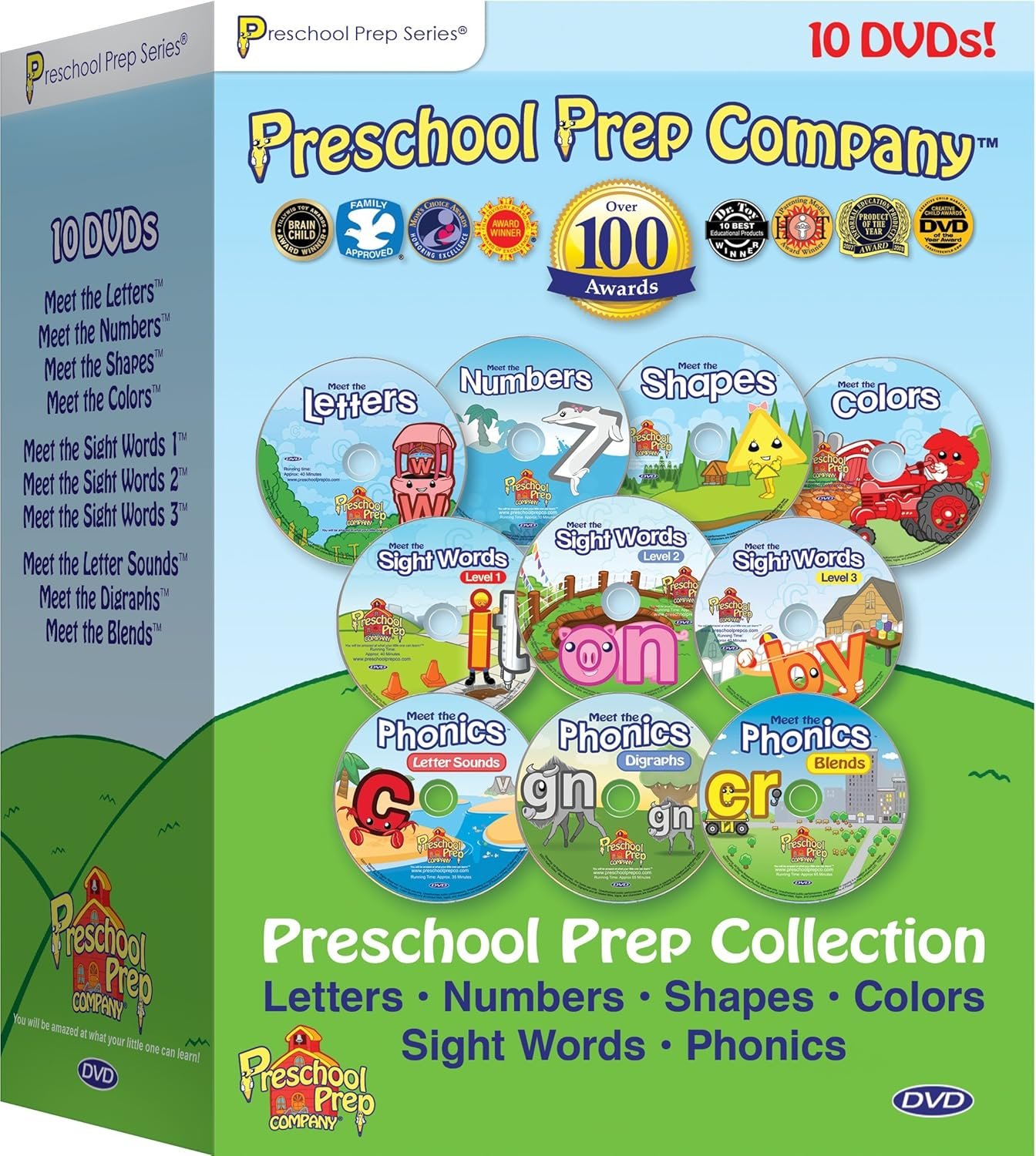 10 DVD Collection This combination of Boxed sets includes all of our award winning DVDs. Meet the Letters, Numbers, Shapes, Colors, Sight Words 1,2 & 3 and Meet the Phonics – Letter Sounds, Digraphs and Blends. Preschool Prep Company DVDs have won over 25 national awards and are used in thousands of schools across the country.
