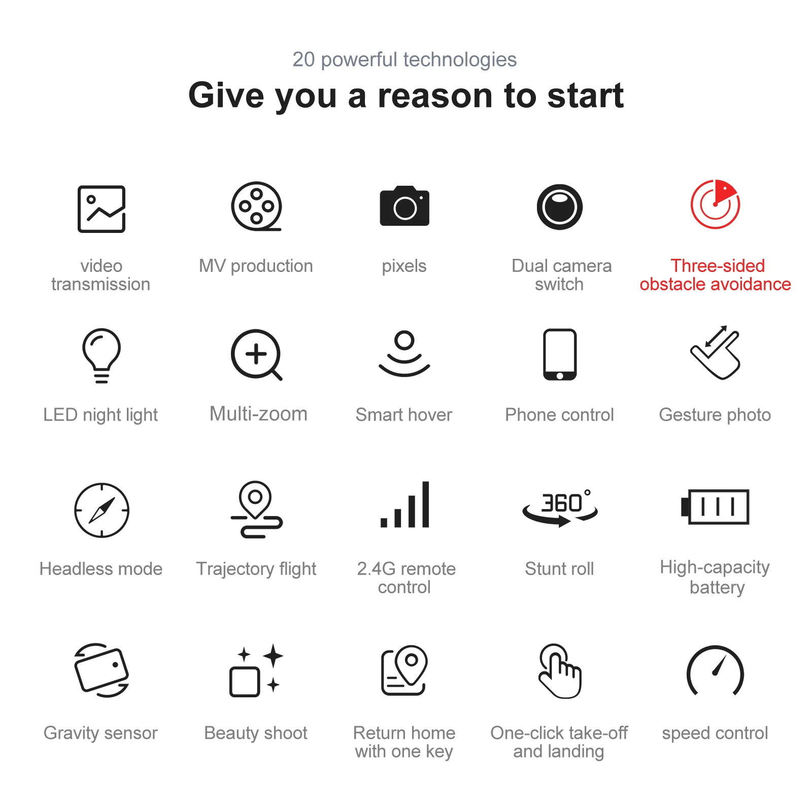 4: With camera can add functions: gesture photo, video, headless mode, emergency stop, trajectory flight, gravity sensor, automatic photo