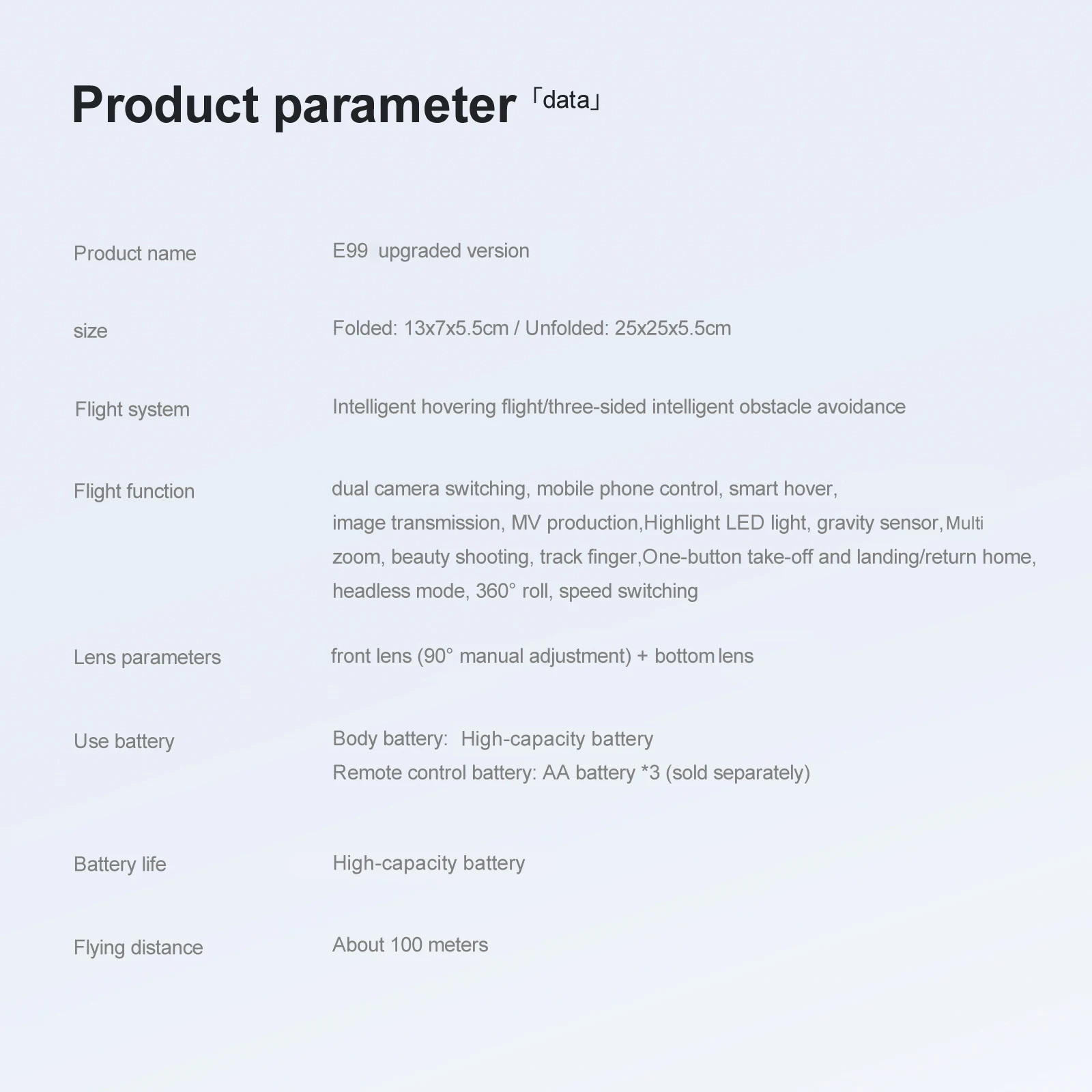 Please read the instructions carefully before use. If you are a beginner, it is recommended that an experienced adult assist. Be careful with the battery: do not overcharge or over discharge. Do not put it in high temperature conditions. Don’t throw it into the fire. Don’t throw it into the water.Please note that the obstacle avoidance model of this E99 has been removed from the shelves. What you bought is a drone without obstacle avoidance.