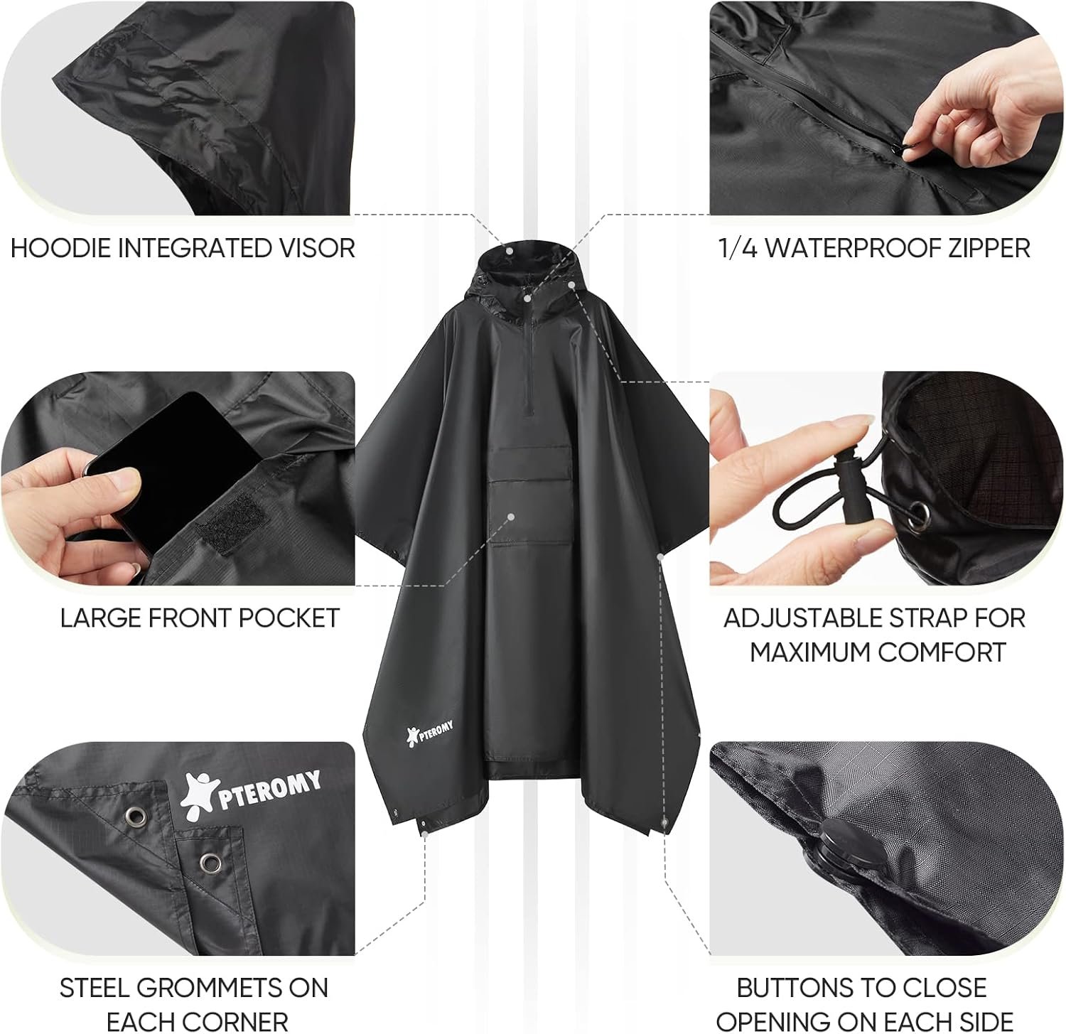 PTEROMY Hooded Rain Poncho for Adult with Pocket, Waterproof Lightweight Unisex Raincoat for Hiking Camping Emergency