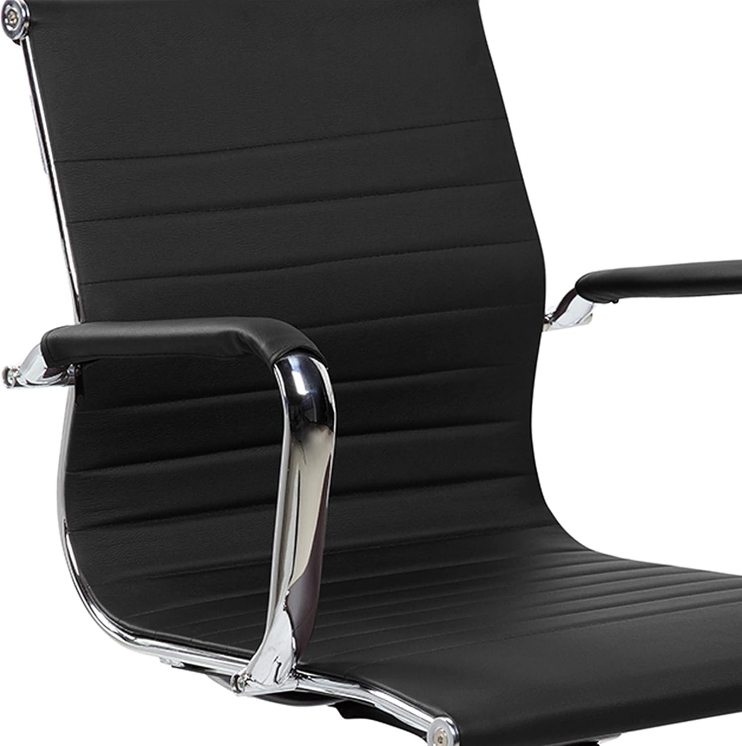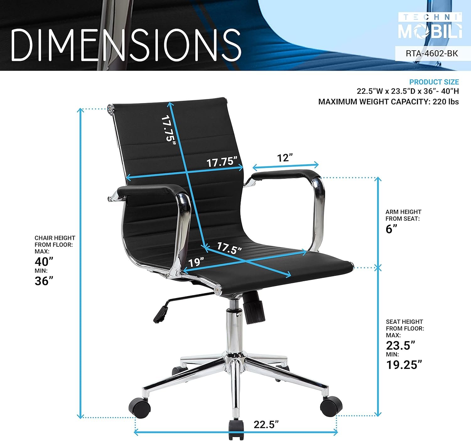 This elegant and modern Techni Mobili Executive Office Chair will add an upscale appearance to your office with its attractive stitched seat and back. Made of TechniFlex upholstery with chrome steel base and chrome arms rests, the comfortable seat has built-in lumbar support, an iconic ribbed design and features a chrome base, pneumatic seat height adjustment, armrests and locking tilt control with tension knob and comfortably fits users up to 220lbs. Color: Black