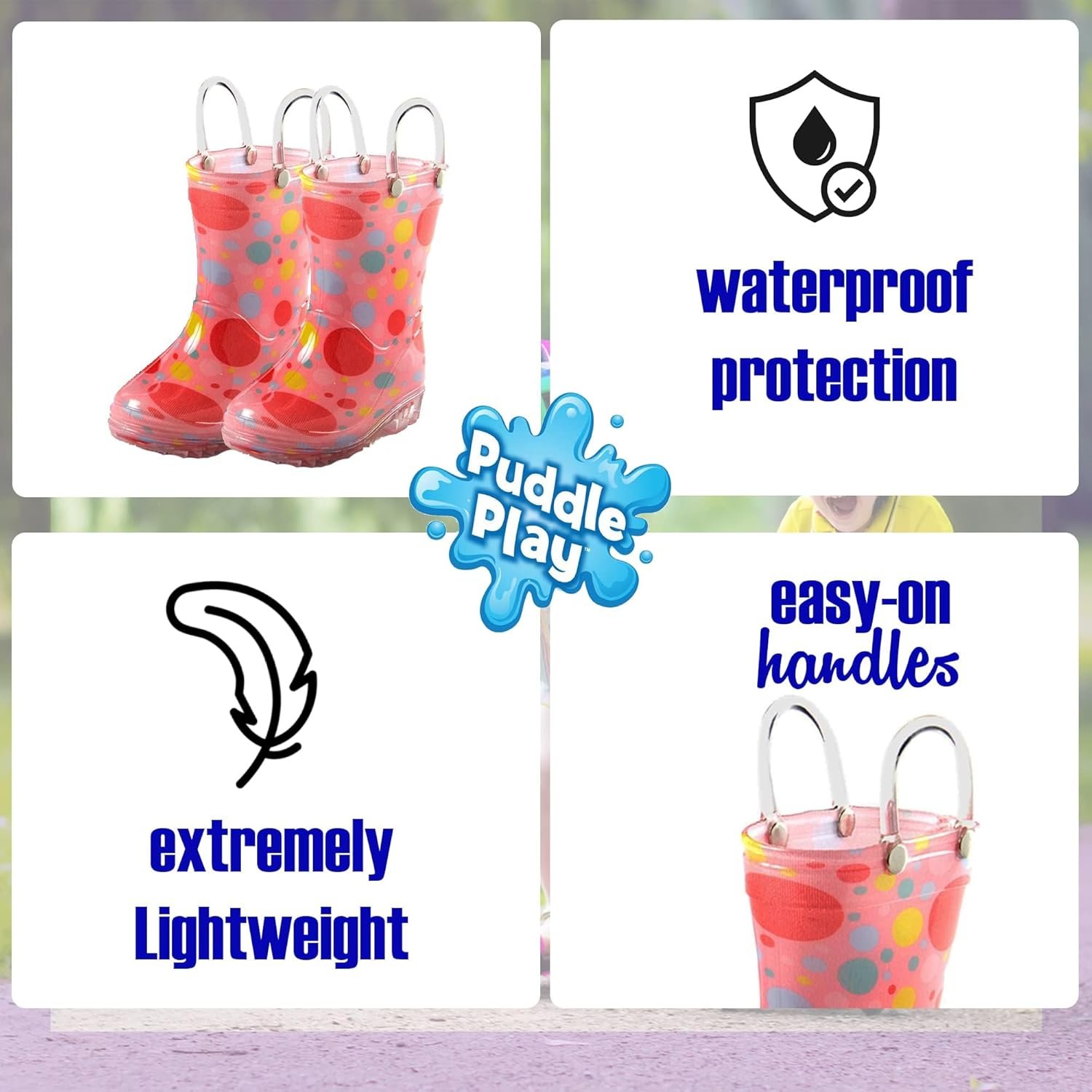 Puddle Play Toddler and Kids Waterproof PVC Rain Boots with Easy-On Handles – Lightweight Slip-Resistant Outdoor Boots for Boys and Girls