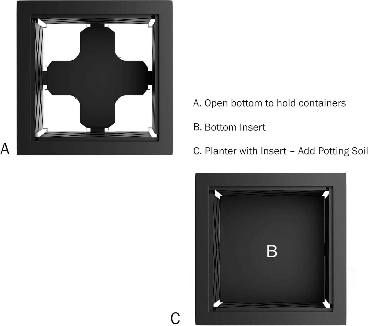 PRODUCT DETAILS – Material: Polypropylene Plastic. Dimensions: (L) 14.75” x (W) 14.75” x (H) 13″; Interior: (L) 11.5” x (W) 11.5”; Weight: 4.6lbs. Tool-free assembly. Drill holes in bottom insert if more drainage is required. Color: Black.