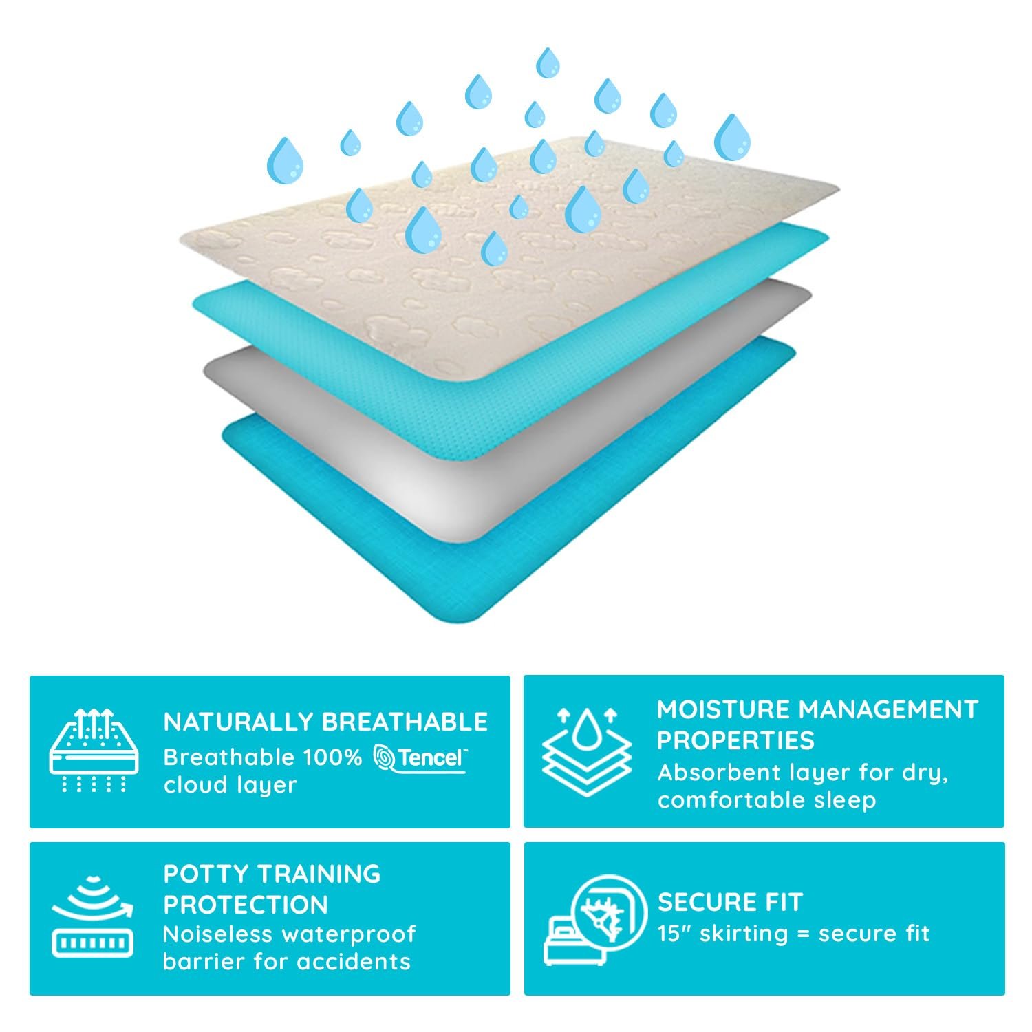 Waterproof Design For Potty Training: The noiseless waterproof barrier protects your crib or toddler mattress from spills and accidents while maintaining a quiet sleep environment. Its practical design is ideal for households with children and works exceptionally well for supporting potty training needs. This layer ensures the mattress remains clean and dry without compromising comfort.