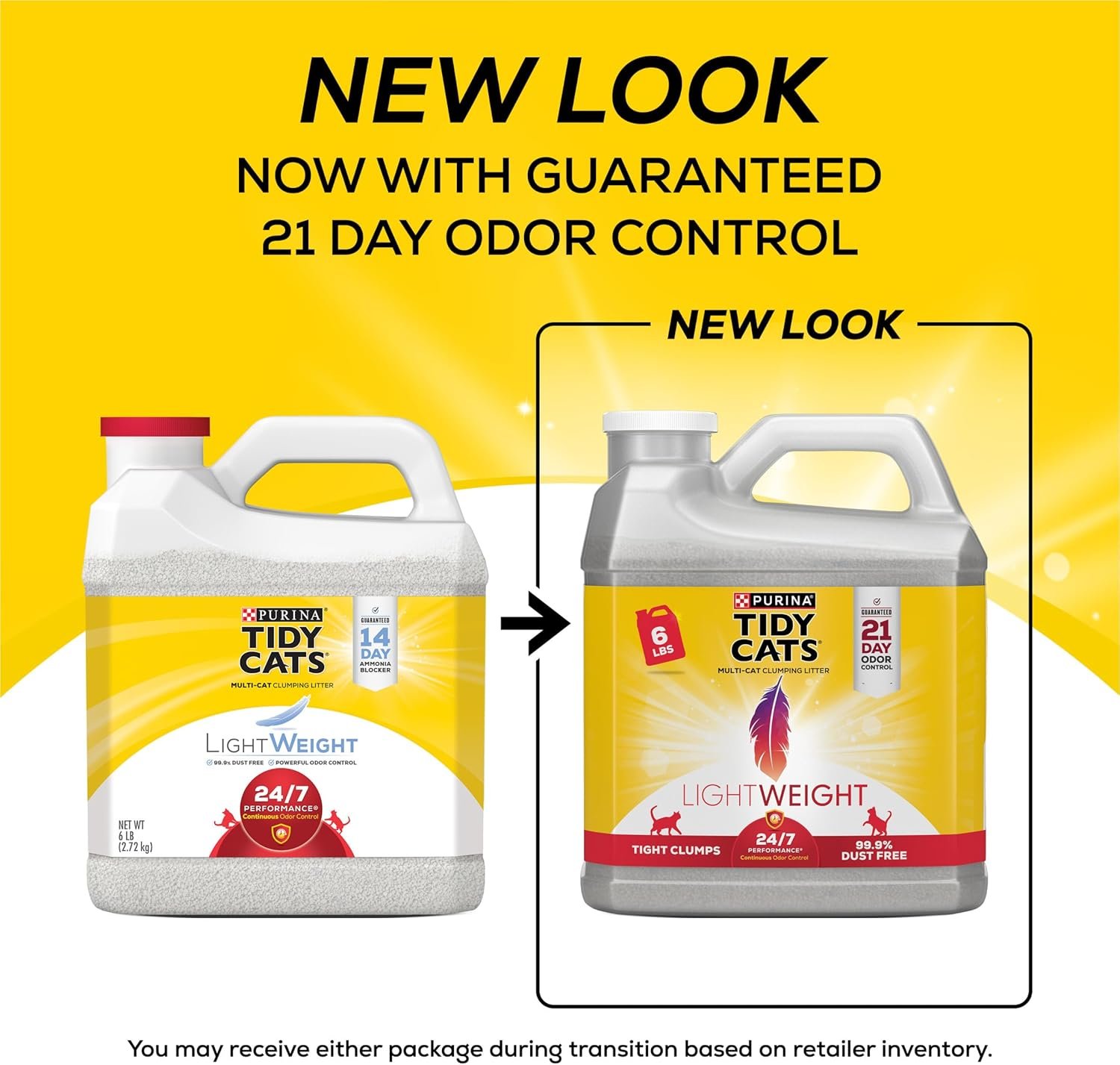 Purina Tidy Cats clumping litter offering guaranteed 21-day odor control that prevents ammonia odor from forming when used as directed