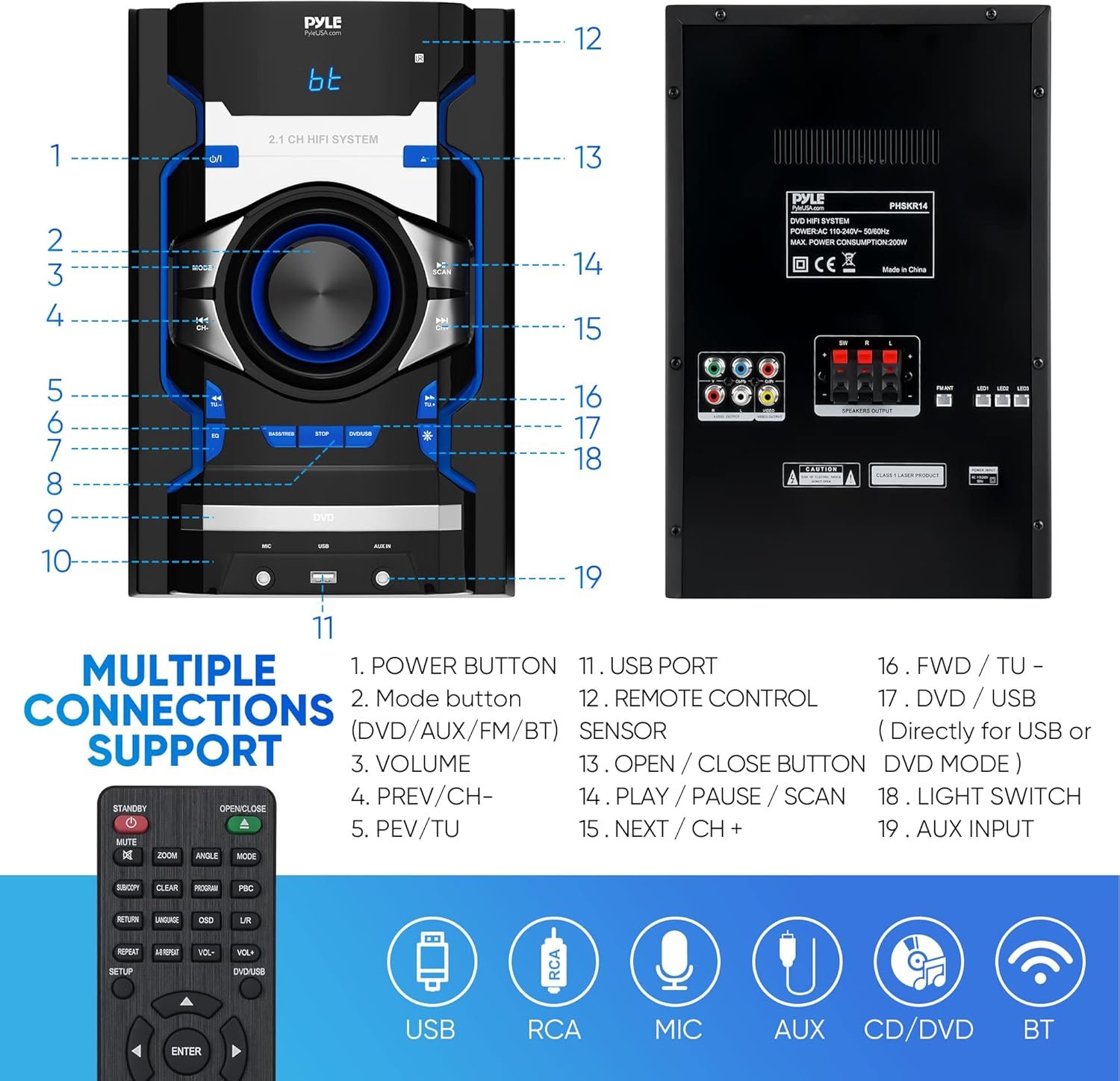 Features: – Compact & Portable Media Entertainment Unit – Built-in Bluetooth for Wireless Audio Streaming – Sound System: 8” Subwoofer – 5.25” medium speaker -3” Tweeter – LED Digital Display Screen – DVD/CD function – FM Radio – USB Flash Drive – Aux (3.5mm) Output – 1/4” Two Microphone Inputs – EQ Mode (Jazz, Class, Rock, Flat, POP) – Connect & Stream Audio from External Devices – Dual Amplifier for Better Sound Performance – Audio-in for Portable Music Playback – High-Quality Sound, Powerful Bass – Sleek and Compact Design – Treble and Bass Adjustment – Lights on Knob and Speakers (Blue) – Blue Colored Speaker Lights – DVD/BT/FM Radio/USB/AUX/Karaoke – Digital Amplifier IC for Strong Sound Wireless Bluetooth Connectivity – Hassle-Free Pairing, Simple Music Streaming – Compatible with All of Today’s Latest Bluetooth Devices – (Smartphones, Tablets, Laptops, Computers, etc.) – Bluetooth Version: 5.0V – Bluetooth Network Name: ‘PHSKR14’ – Wireless Bluetooth Range: Up to 30.0’ ft. What’s in the Box: – Wireless BT Streaming DVD Stereo System – Remote Control – AC/DC Power Cord – FM Antenna Cable Technical Specs: – Power Output: 800 Watt MAX – Impedance: 4 Ohm+8 Ohm – Frequency Response: 120Hz-15KHz – Sensitivity (1w/1m): 650mV – Signal to Noise Ratio: 52dB – T.H.D.: <10% - Low Frequency: 120Hz-4KHz - High Frequency: 4KHz-15KHz - Remote Control Battery Operated, requires (2) x 'AAA' Batteries (not Included) - Battery Type: UM-4 1.5V Dry battery - Digital File Support: MP3, MPEG4, WMA, WAV, AVI, MPG, 3GP, FLV, FLAC. - Maximum USB Flash Support: 32GB - Power Supply: 110/220V - Dimensions (L x W x H): 12’’ x 15.6’’ x 36’’ –inches