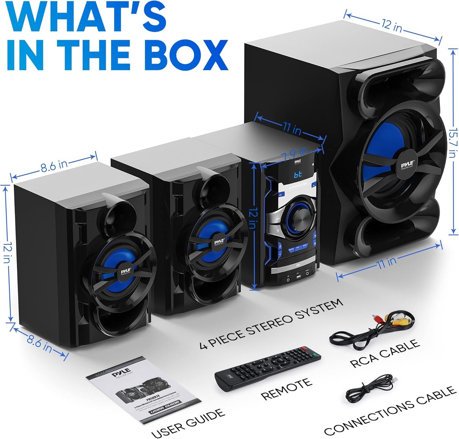 A: This sleek and compact stereo system for home consists of an 8-inch subwoofer, a 5.25″ speaker, and a 3″ tweeter, delivering high-quality and clear sound. The combination of these components ensures an immersive audio experience, making it an excellent choice for home stereo system enthusiasts.