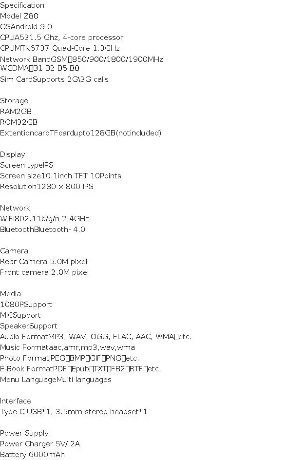 Quad-Core 10.1 INCH Type-C 3G Phone Tablet Android 9.0 2GB Ram 32GB Rom 1280 x 800 IPS 6000mAh