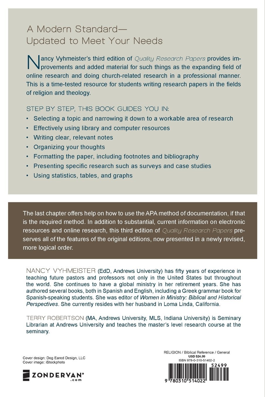 This updated third edition of Quality Research Papers—fast becoming a standard reference textbook for writing research papers in the fields of religion and theology—gives improvements and added material for such things as the expanding field of online research and doing church-related research in a professional manner.