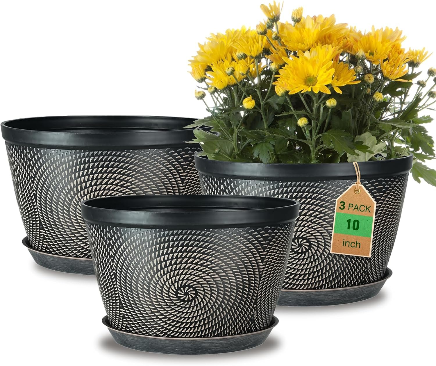 Quarut 10 Inch Flower Pots for Outdoor Indoor, 3 Pack Plastic Plant Pots with Drainage Hole & Tray, Modern Decorative Garden Pot with Saucer, planters for House (Brown)