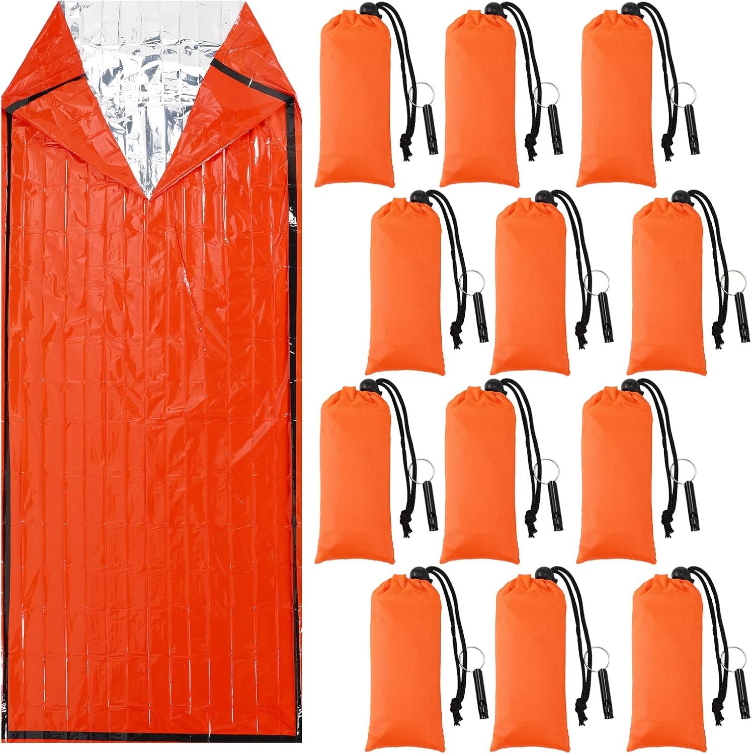 Qunclay 12 Set Emergency Sleeping Bag Survival Bivvy Sack Blanket with Whistles Lightweight Portable Thermal Survival Bag Thick Tent with Hood Extension Nylon Stuff Sack