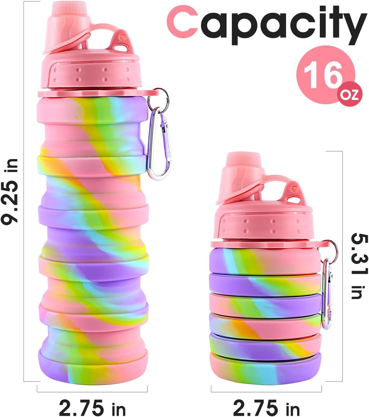 Rainbow Collapsible Folding Water Bottles for Kids, Students, Adults, Reusable BPA Free Silicone Foldable Sports Water Bottles for Travel Camping Hiking, Pink