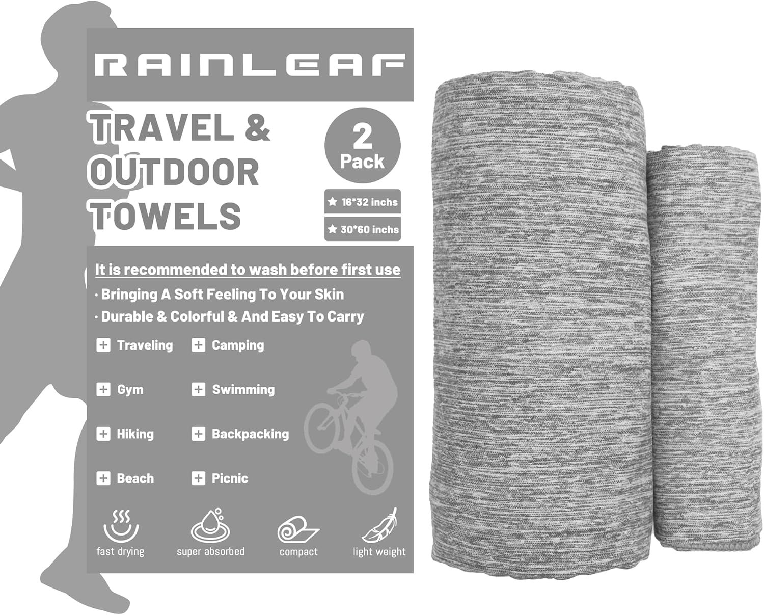 MULTI USE: Rainleaf microfiber towel set comes in two sizes and is available in 19 vibrant colors. 30″x60″ is suitable for camping trip and beach. 16″x32″ works well for workout, backpacking.