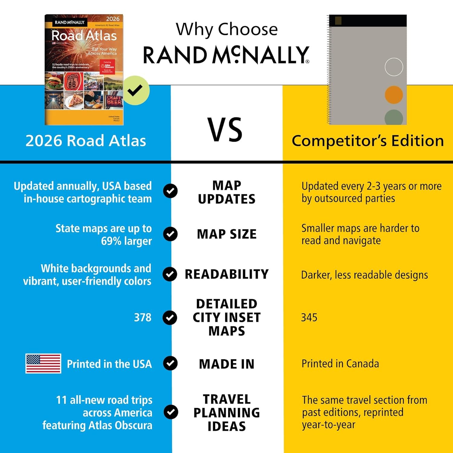 If having the most up to date and accurate maps developed by the #1 map company are important to you, then Rand McNally is your only choice. We have a 150+ year history of providing not just road and route guidance, but detailed information about the states, points of interest, historic sites, and much more. Another new feature offered by Rand McNally in our 2026 edition celebrating the USA’s 250th birthday and Route 66’s 100th anniversary, we’ve mapped out 11 extraordinary culinary road trips that explore the best of America’s regional cuisine.