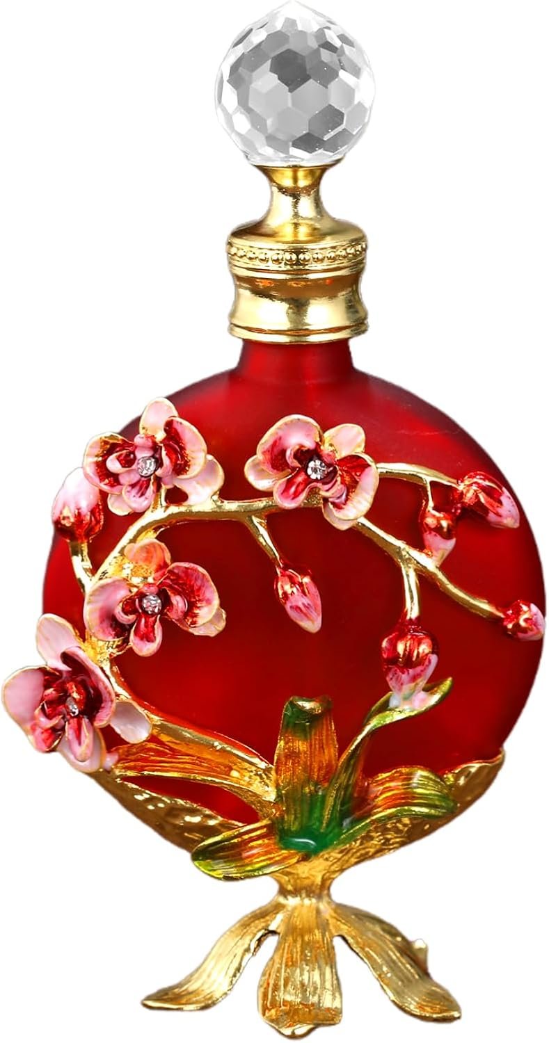 Made of high quality glass and metal, vintage peach blossom flower metal base decor design, inlay crystal glass rhinestone, delicacy glass bottle, small and exquisite, an elegant decoration to decor your home dresser tabletop countertop.