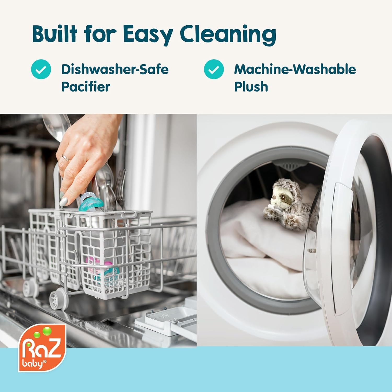 Easy to Clean & Sterilize: The RaZbuddy plush is machine washable for effortless maintenance, while the detachable JollyPop pacifier should be sterilized first, then dishwasher-safe for easy cleaning and convenient attachment swaps.