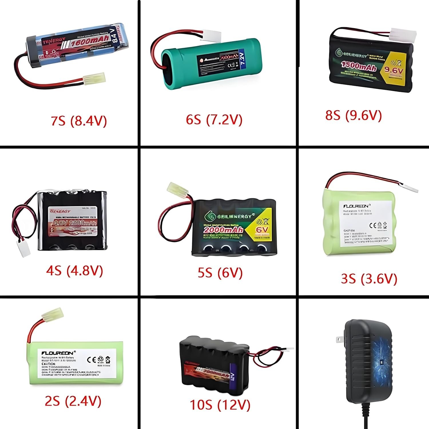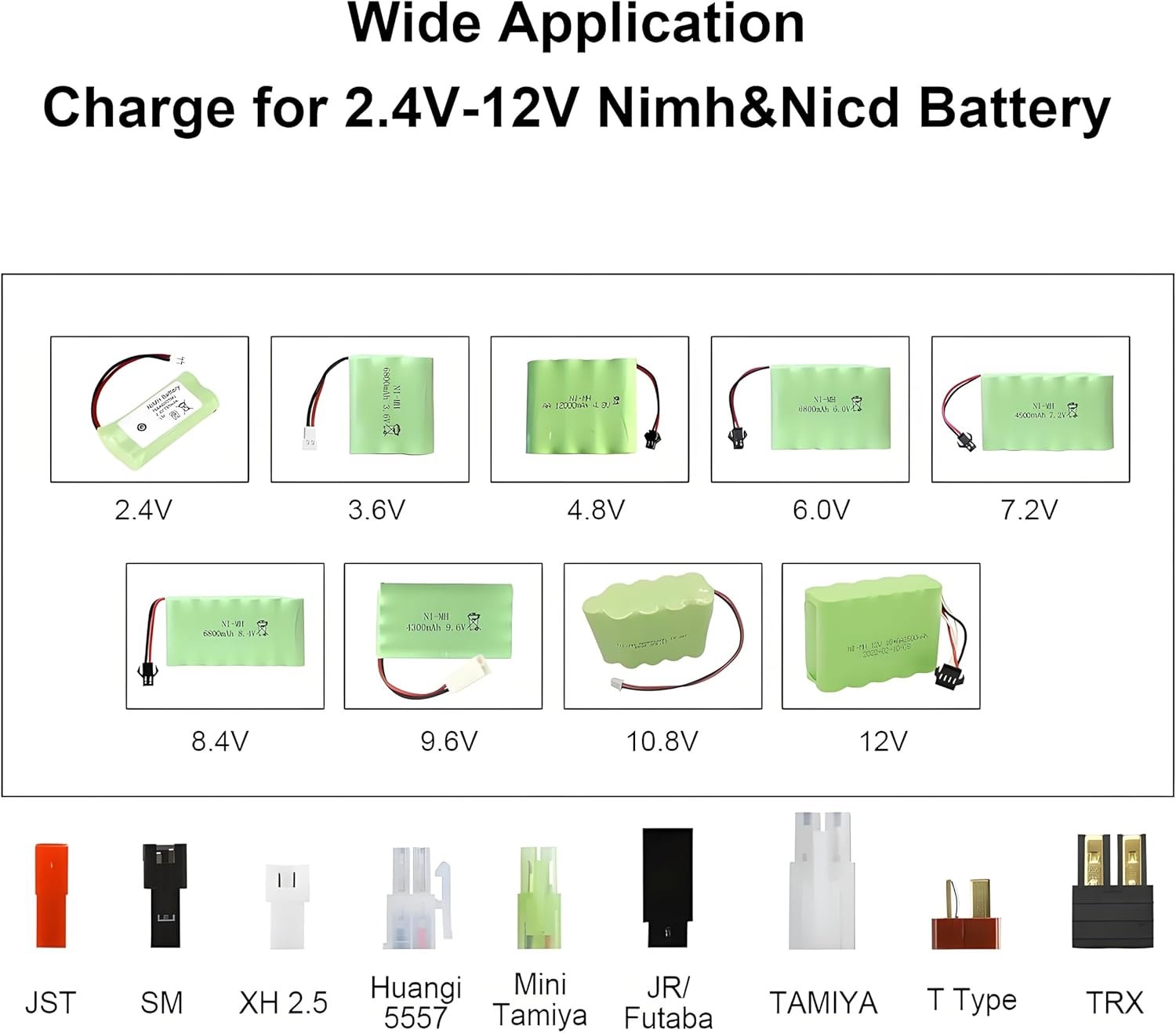 Widely Compatability:Charges NiMH/NiCd RC car battery pack of 2-10 cells(2.4V,3.6V,4.8V,6.0V,7.2V,8.4V,9.6V, 10.8V,12V)NOTE: only for recharging NiMH/NiCd batteries, CAN’T USER FOR LiPo /Li-ion/LiFePO4 batteries. Note: Only one battery is allowed to be charged per use, simultaneous charging of multiple batteries is prohibited!