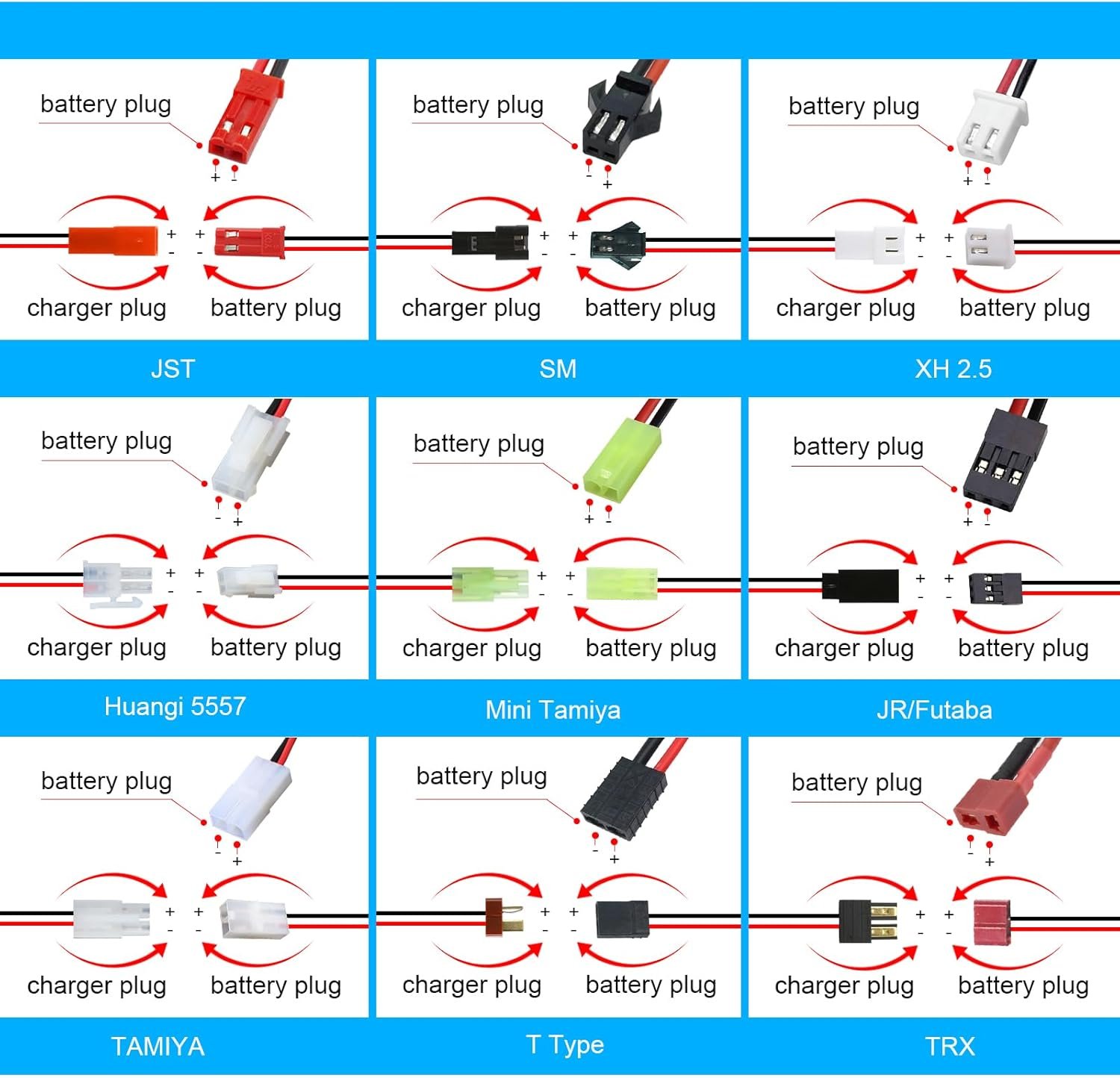 Different RC Car Charging Plugs-JST Battery Plug/SM Battery Plug/XH 2.5 Plug/Huangi Plug/Mini Tamiya Battery Plug/JR/ Futaba Plug/TAMIYA Battery Plug/T Type Plug/TRX Plug