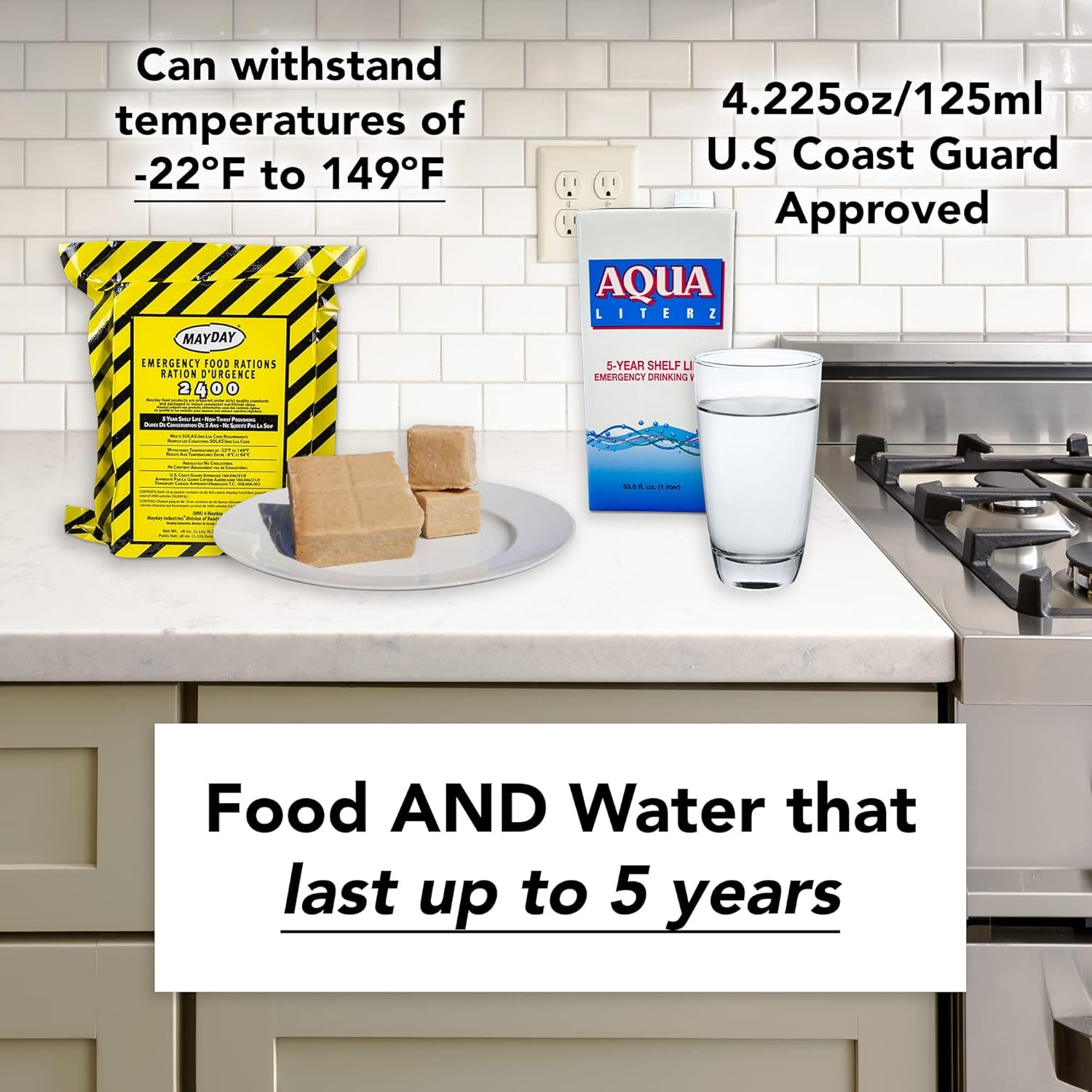 Food, water, emergency blankets: Everything you need in case of an emergency. 4 survival food bars (2400 calories) and water pouches with a 5-year shelf life, survival blankets, disposable dust masks, nitrile gloves, whistle, ponchos, pocket tissues