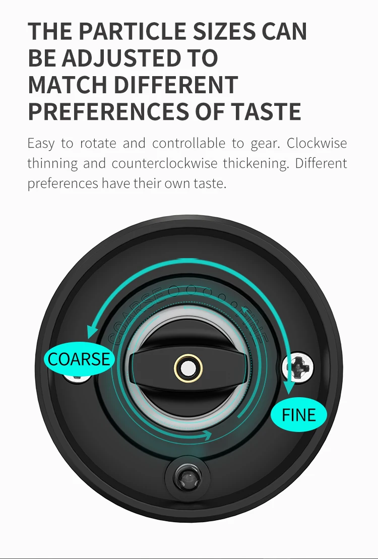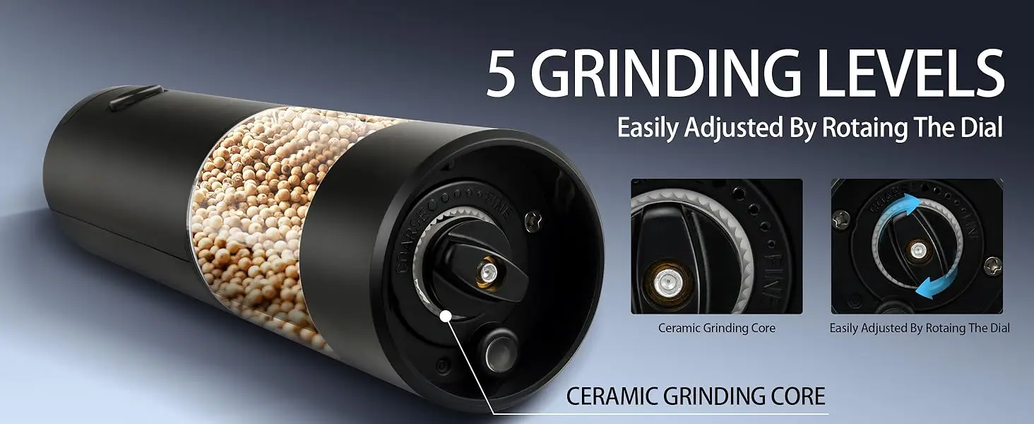 ðŸ‘ã€Many Adjustable Coarseness】Turn the electric pepper grinder knob at the bottom of the device to adjust the coarseness you like. It can ground into fine particles by rotating clockwise, and coarse particles by rotating counterclockwise, suitable for sea salt, black pepper, gold pepper, white pepper and other solid spices.