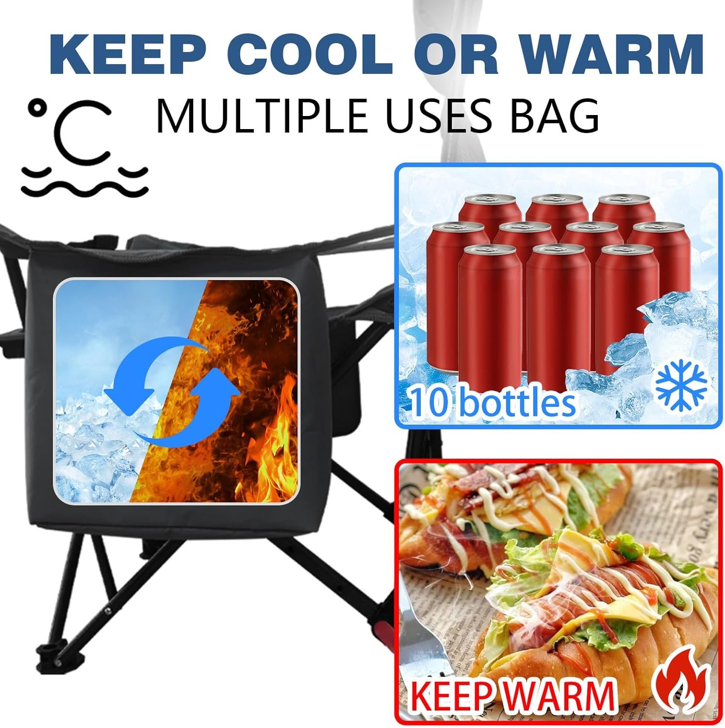 Cotton Pad & Cooler Bag: Cotton pads can be used according to your needs to make your posture more comfortable and warm all year round. Our outdoor camping chair features a spacious cooler bag capable of holding at least 10 cans, keeping your drinks chilled for hours. The chair also boasts a uniquely designed cup holder to free your hands, and side pockets for securing your mobile phone, tablet, magazines, or maps.
