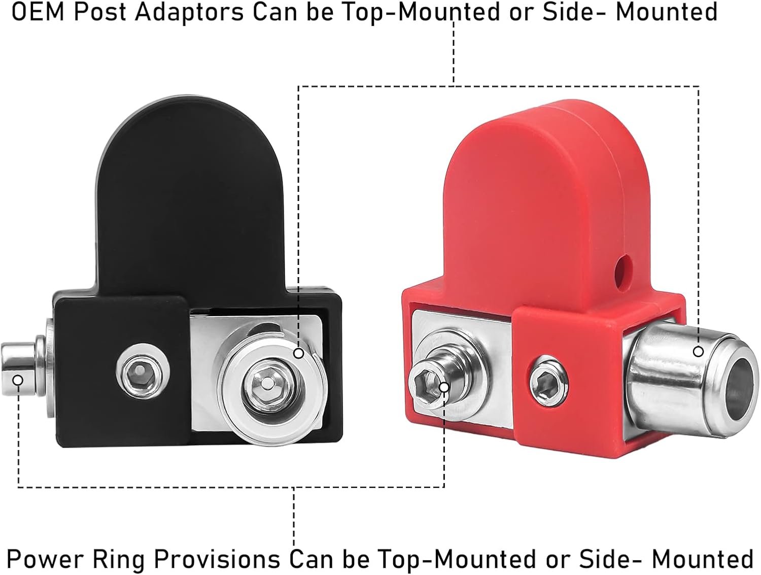 The top-mounted or side-mounted post adapters are perfect for OEM Integration, no cutting of your factory OEM battery clamp.