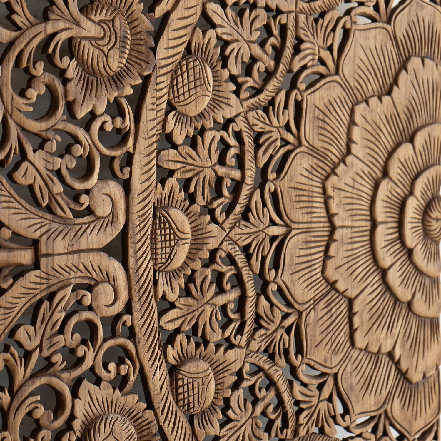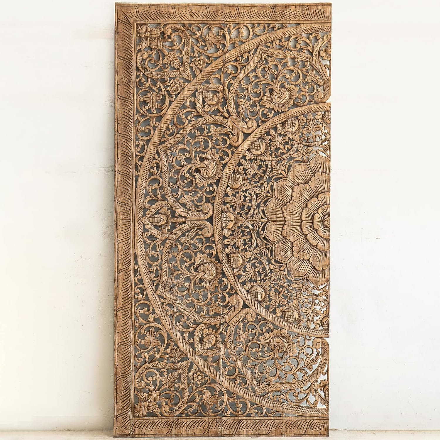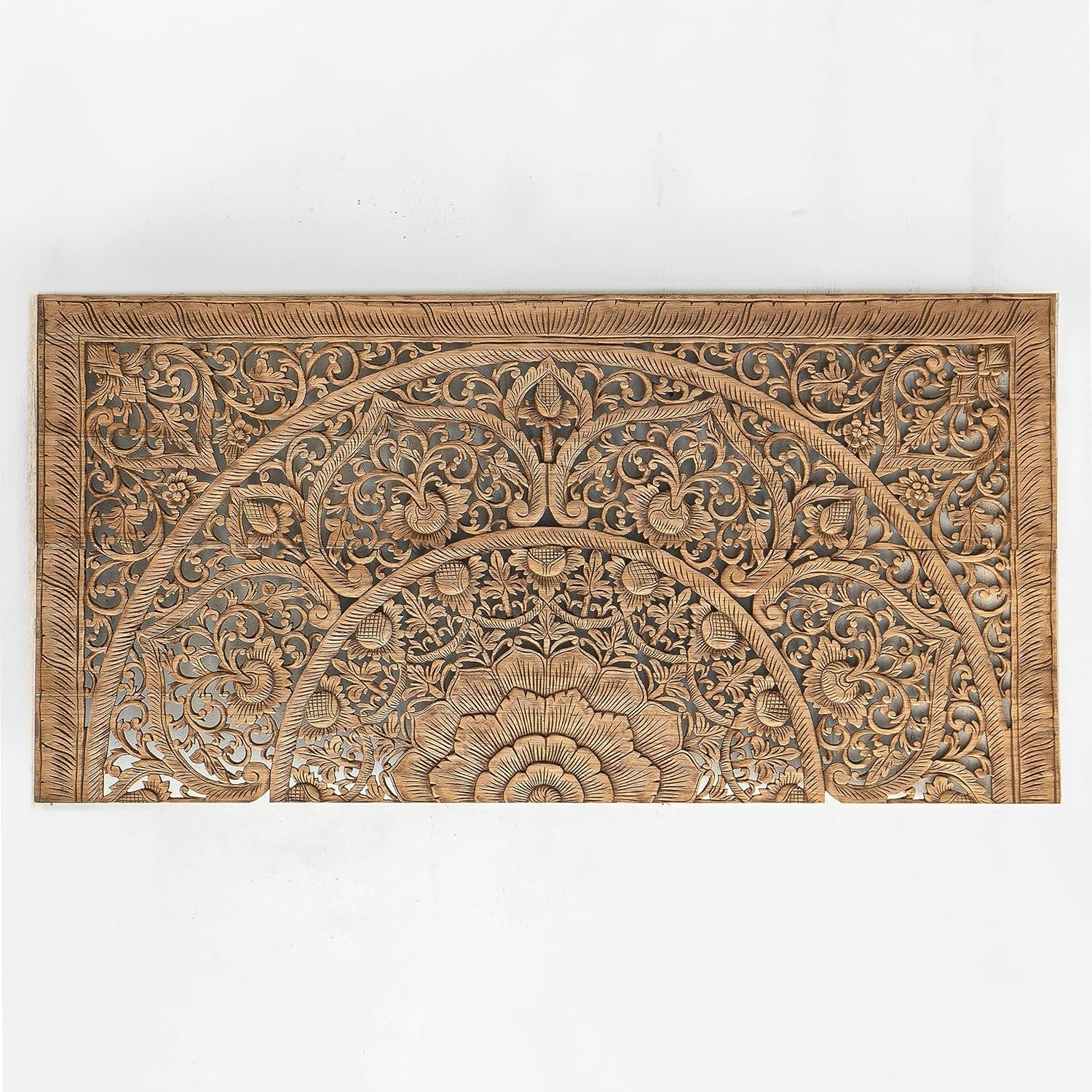 Intricate floral wood carved bed headboard in weather brown finish. Wonderful oriental wall art hanging for your living room