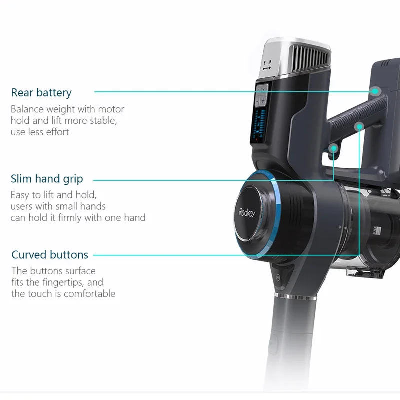 ��ã€Ergonomic Design】This foldable cordless vacuum cleaner is less resilient and avoids a burden on the arm. The battery is mounted at the back and compensates for the weight of the engine, whereby the handle and lifting become more stable. Slim handle. It’s easy to lift and hold this pet vacuum cleaner. Curved keys, the curvature of the key surface fits the fingertips and feels pleasant.