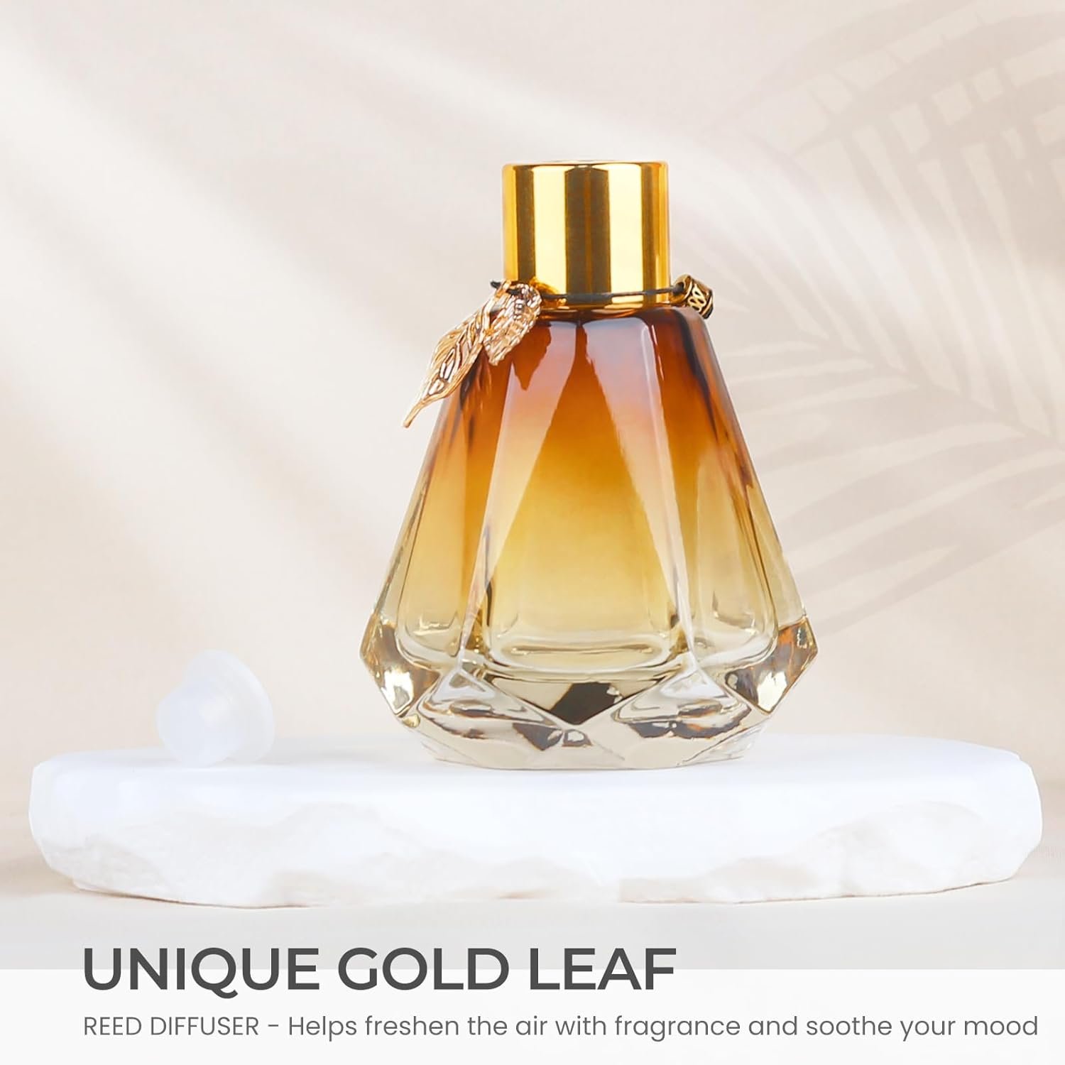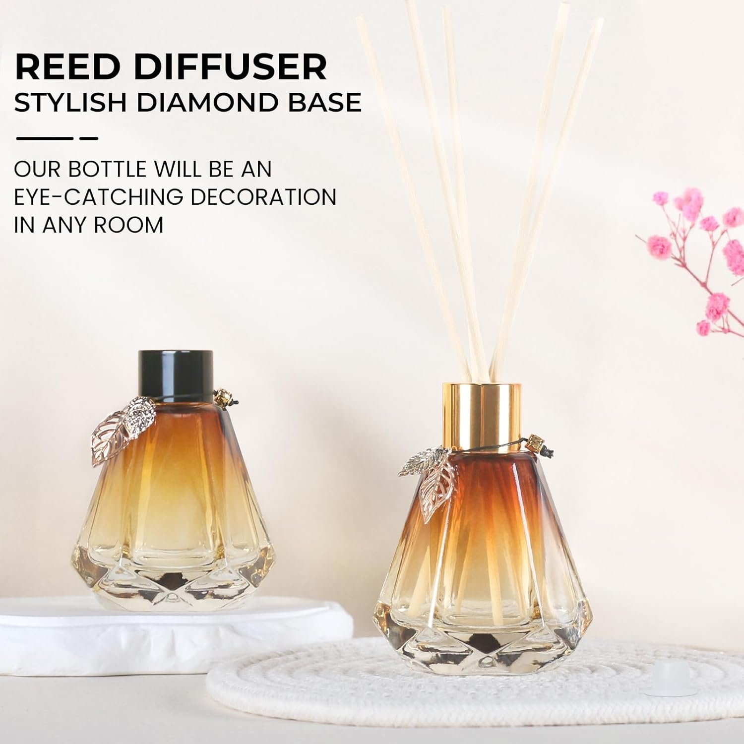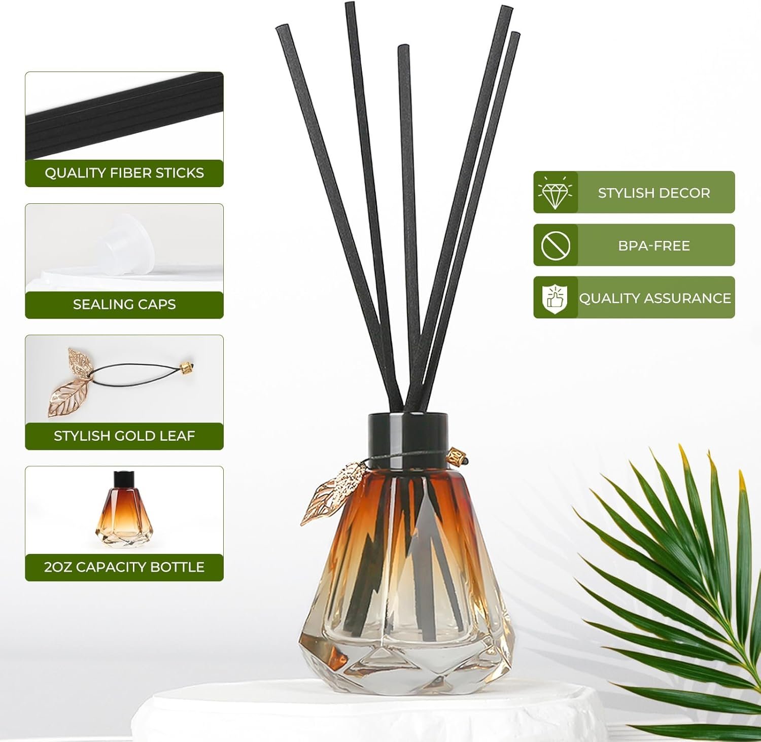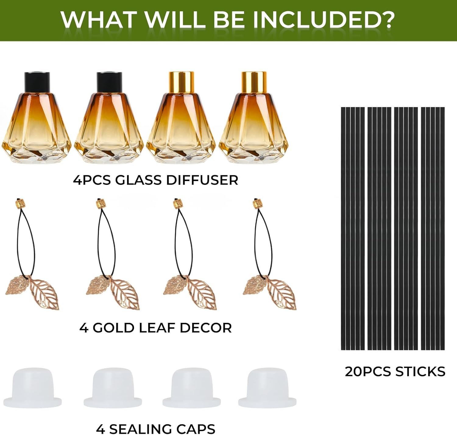 Complete Set: Includes four 2 oz diamond glass diffuser bottles, 20 log-colored sticks and gold metal leaves add a stylish touch