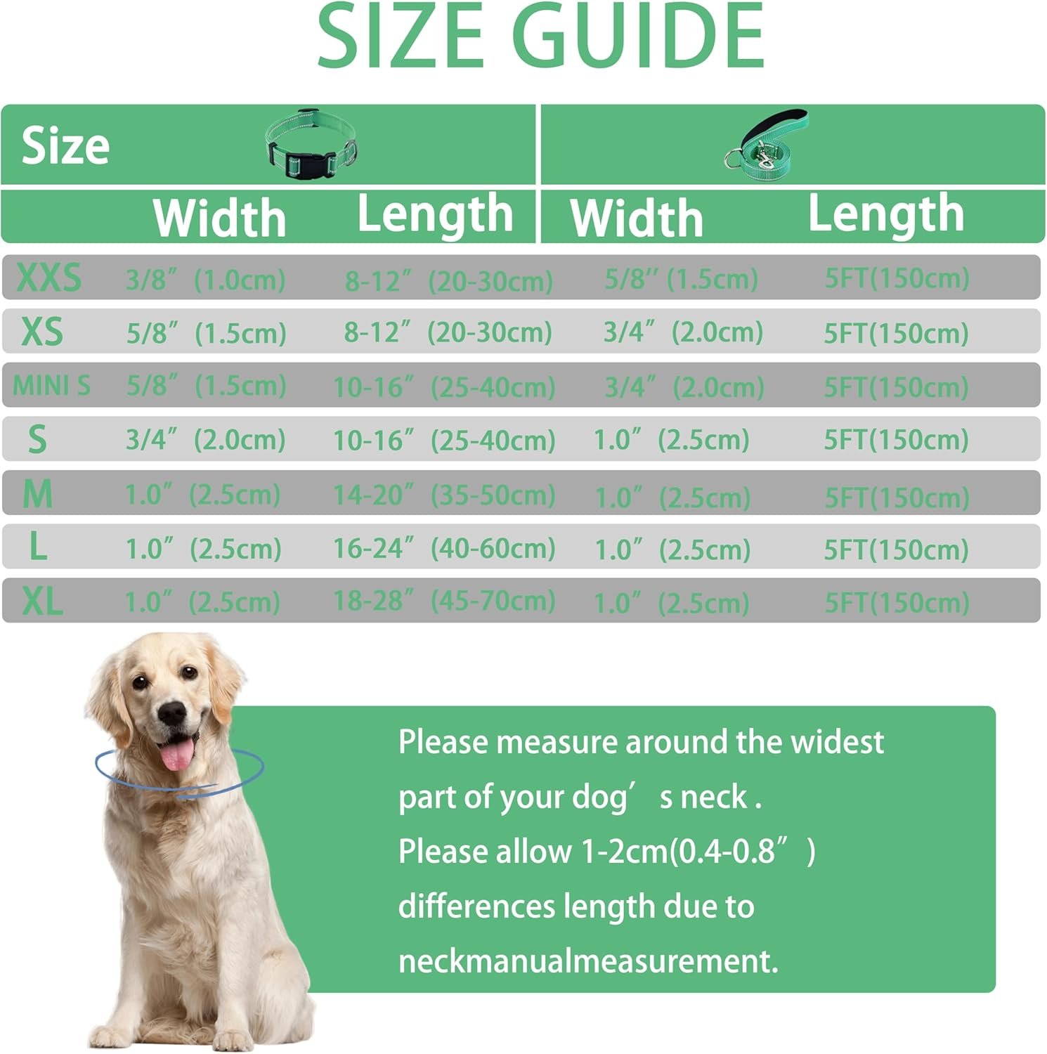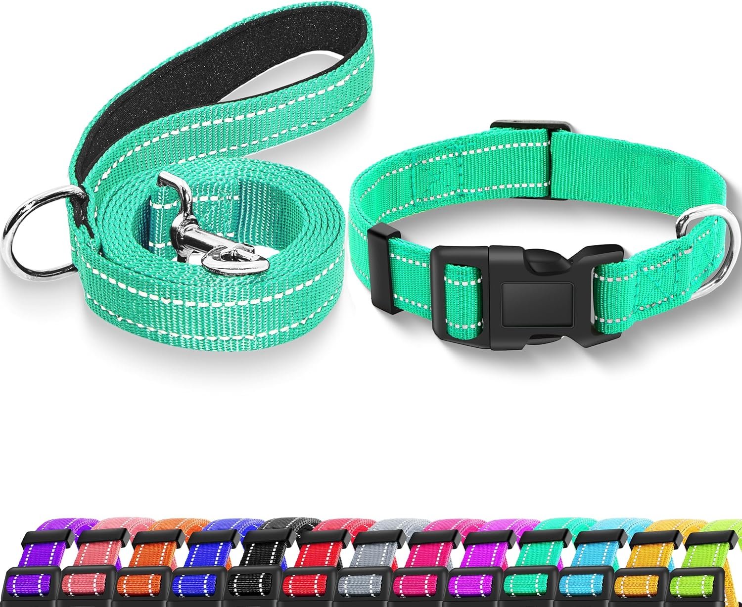Reflective Dog Collar with Safety Locking Buckle, Adjustable Soft Breathable Nylon Collars for Small, Medium and Large Dogs(Collar+Leash S Width 3/4″ Turquoise)
