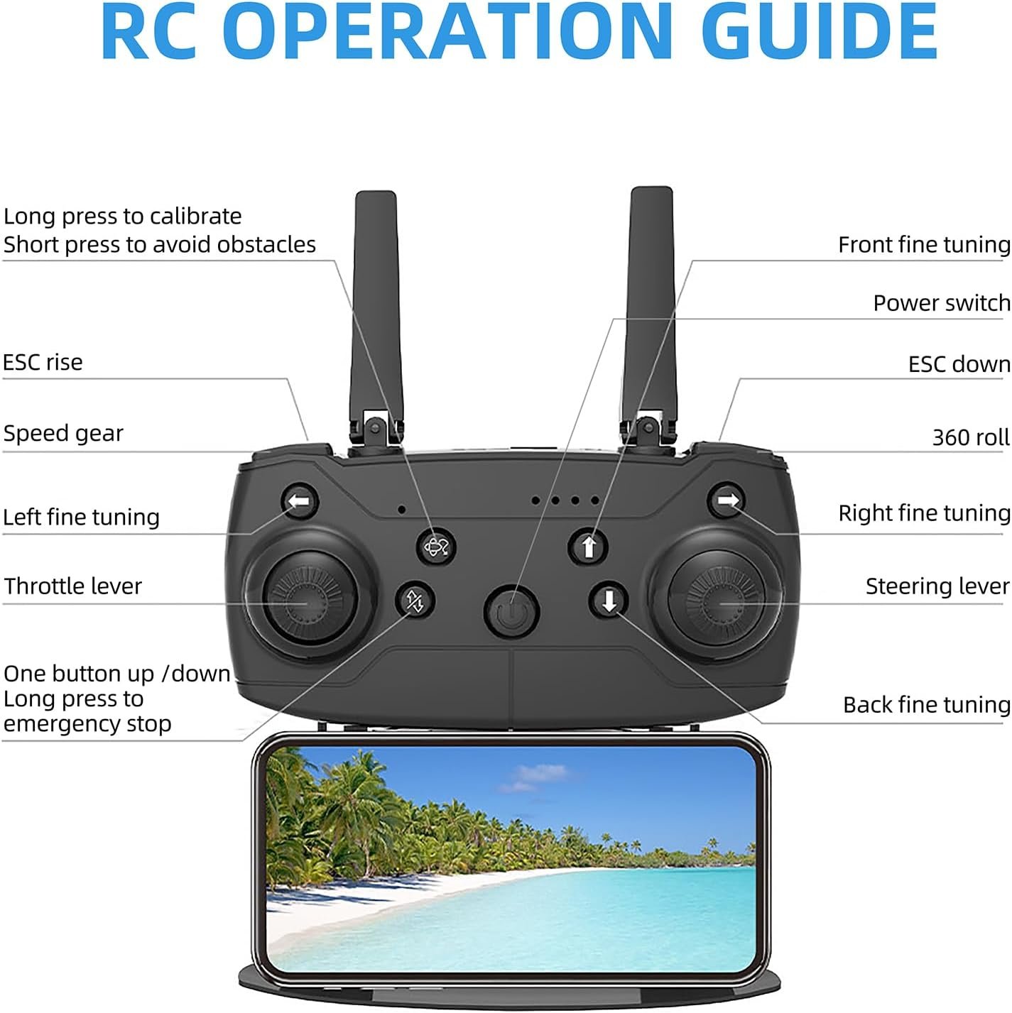 Gravity Sensor If you want to control the direction of your drone’s flight with your phone, simply turn on gravity-sensing mode, allowing you to fly your drone with camera in ways you’ve never done before. Three Adjustable Speeds This fpv drone has different speed modes from low to high, suitable for beginners and intermediates and experts. You can have a different flight experience for fun. Emergency Stop In any case, when you lose control of the drone, shut the drone off with one function button. Don’t worry about losing it! Headless Mode Headless mode is activated by a button on the controller and is a nice feature that allows you to play with the drone without worrying about the direction it is facing. Headless mode brings more confidence to beginners. Gesture Photo Video Allow to control the drone with simple gesture like “ palm” “ fist”. Post a palm sign or fist sign in front of the camera, the drone can automatically take photos or video, good for selfie.
