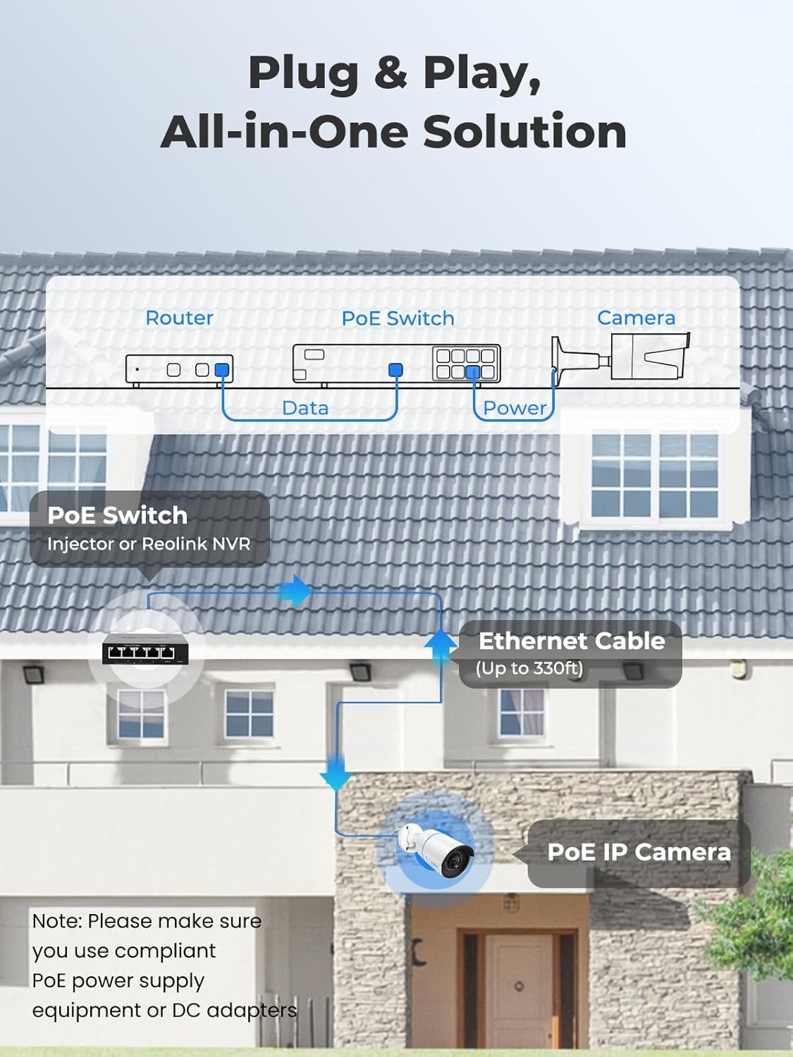 Notice: Cameras in the kit can only be used with Reolink PoE NVR. Cameras in the kit cannot work with Smart Home devices such as Alexa. This camera is NOT a Wi-Fi camera. Please make sure to use compliant PoE power supply equipment or DC adapters. All Reolink products are covered by a 2-year warranty; please contact customer support if you encounter any issues.