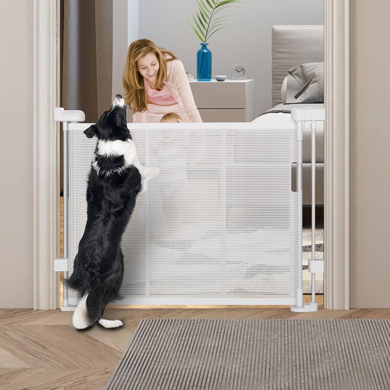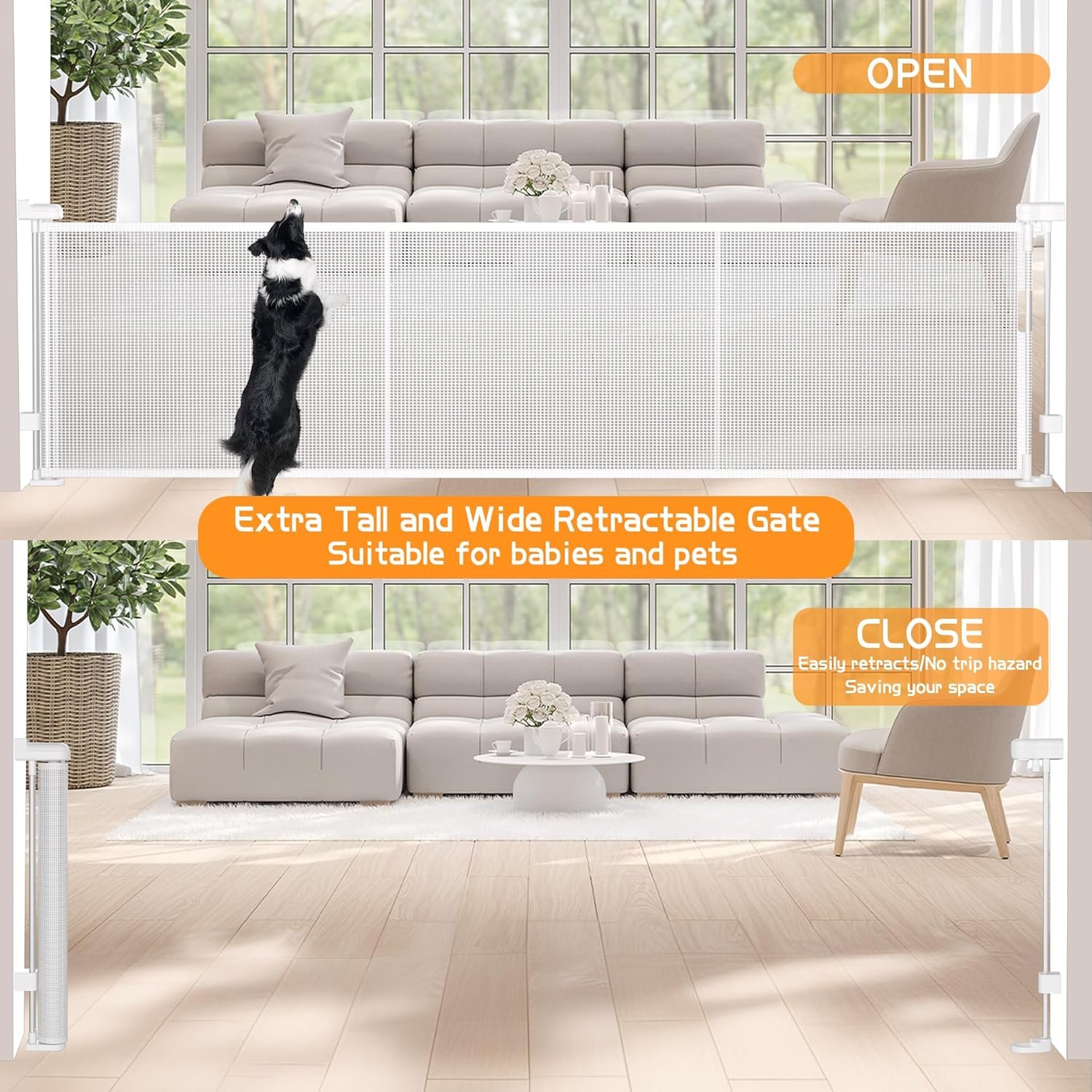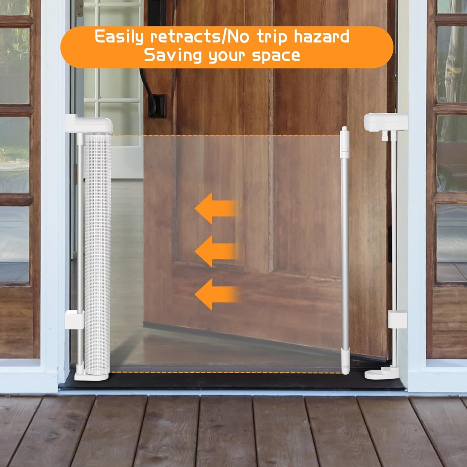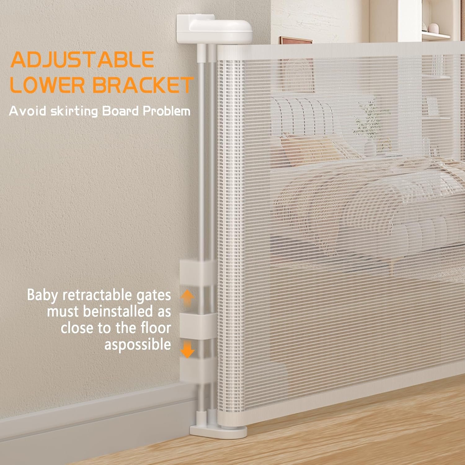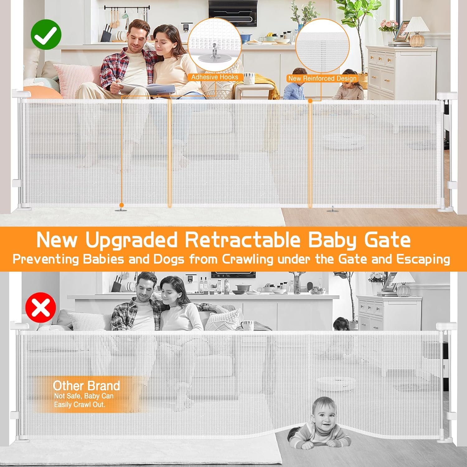 Upgraded Reinforcement Retractable Baby Gates: With reinforcement fiberglass rod, no lagging, deforming and lifting, prevent baby and pets crawl under the gates
