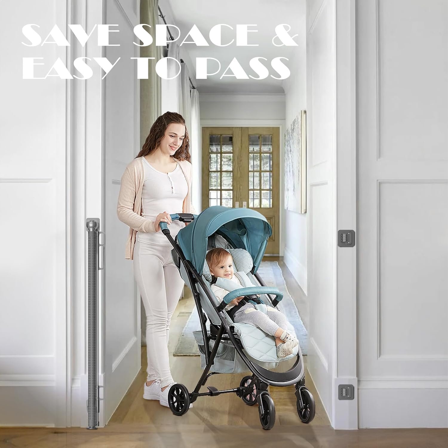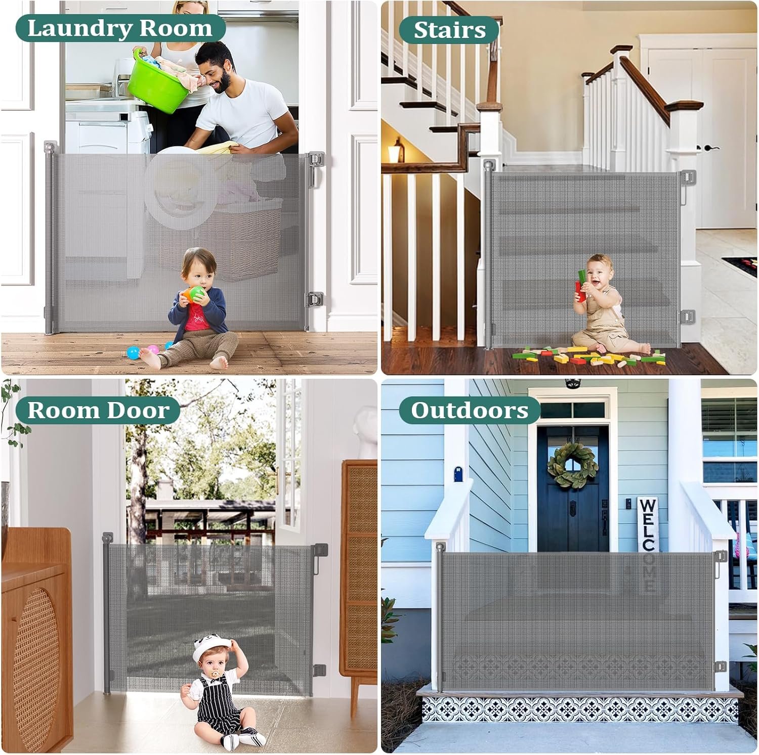 Versatile Baby Gate – This retractable baby gates for Stairs can be used in doorways, hallways, stairways, deck, porch and patio to create a safe play area for your little baby